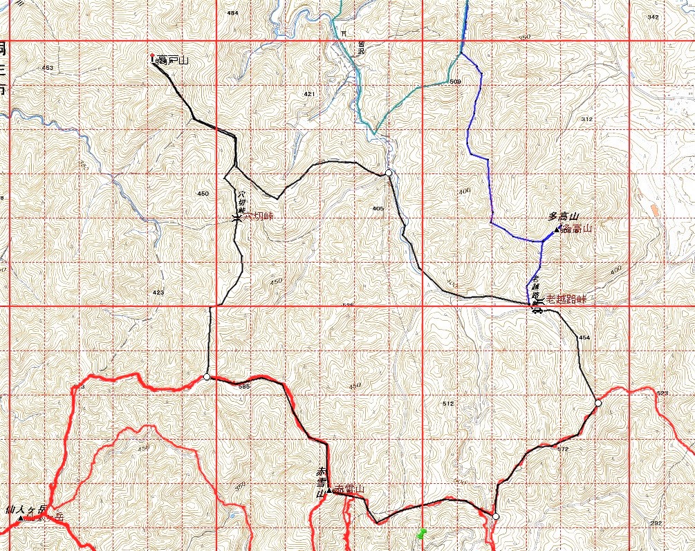 老越路峠から赤雪山への稜線に登って、赤雪山から高戸山まで歩いて、県道に下山した。