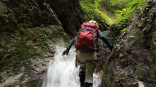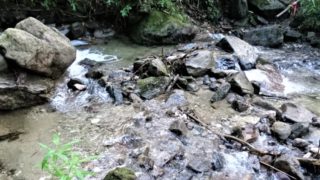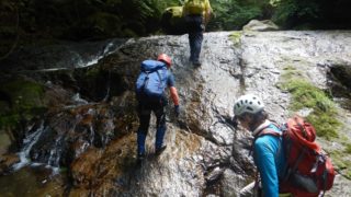 いきなり沢を渡る夜露に濡れた笹の下ルートは荒れている...