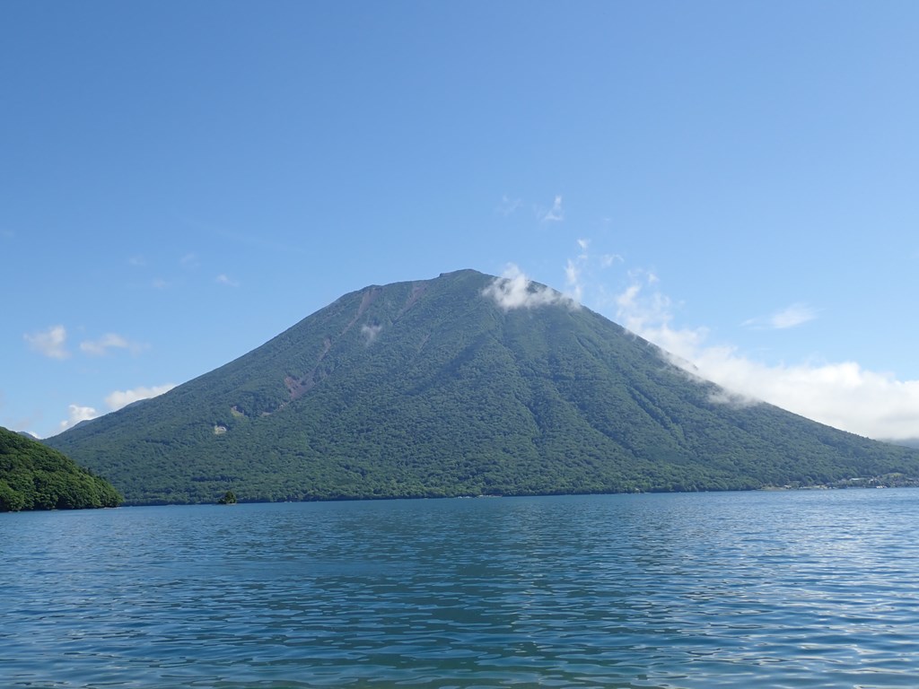 中禅寺湖南岸の遊歩道を西へ進む。イタリア大使館別荘跡の近くに遊覧船の船着場ができていた。そこから男体山を見ると右半分が雲に隠れていた。狸窪までは舗装されているが、ゲートからは未舗装の遊歩道になる。八丁出島の付根で、出島への踏跡を確認した。地形図には実線の道が載っているが、遊歩道から見えたのは踏跡レベルだった。出島へもまだ行ったことがない。反対側の中善寺山への尾根を見上げた。その尾根もまだ歩いていない。