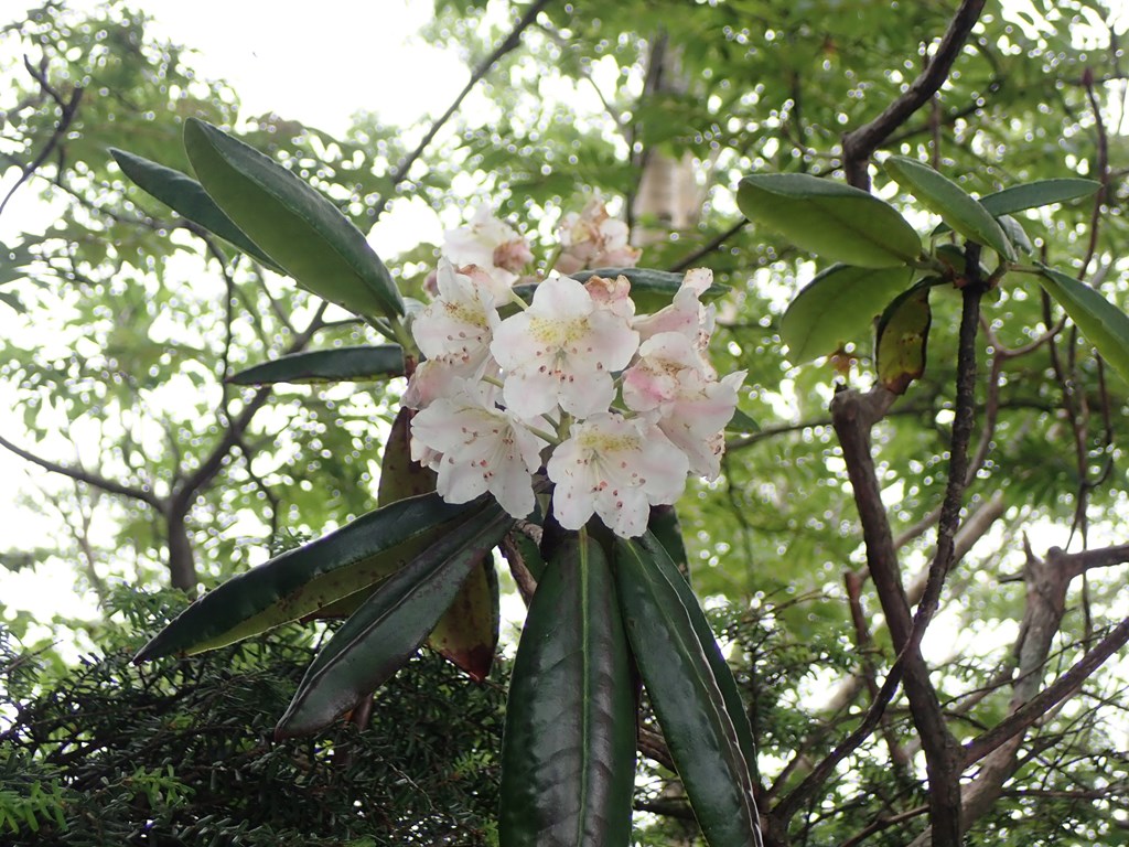 山頂に着いた。足尾側も男体山側もガスで眺望なし。私たちを追い越して先に山頂に着いていた3人組が下山していった。山頂で大休止。山頂ではシャクナゲが少し咲き残っていた。下山開始。後からやって来たご婦人としばらく一緒に下って行った。佐野から電車とバスでやってきたらしい。肋骨にひびが入っていると言っていたが、足取りはしっかりしている。私たちが水飲み休憩すると、「ではお先に」と元気に下って行った。