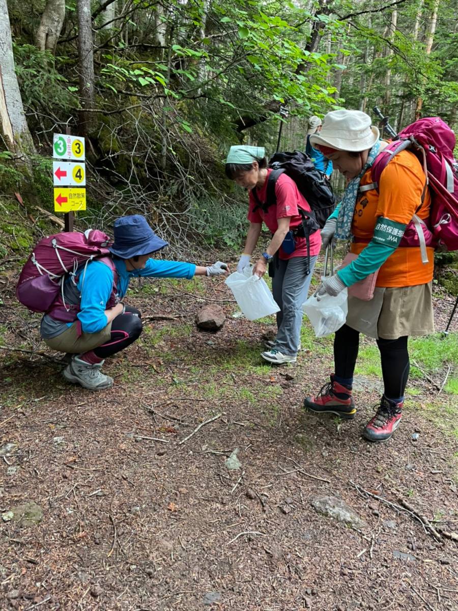 総勢10名で終点からコマクサの群落や天空の足湯等見学してから山に入りました。活動を始めてからしばらくたつとゴロっと雷がなり、心配になりましたが雨はなく活動をつづけました。ごみ自体は小さなもので量も少なく、それでもみんなで持ち寄ると結構買い物袋2つくらいにはなりました。2時間ほど活動していると雨もちらほら来たので、雷鳴もやまないので、切り上げることにしました。