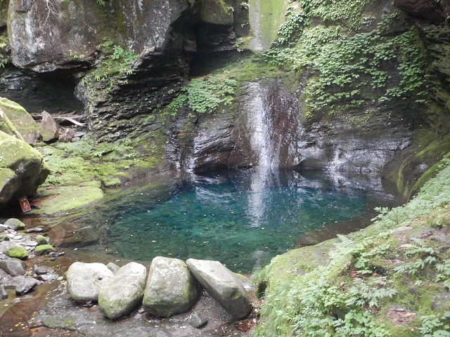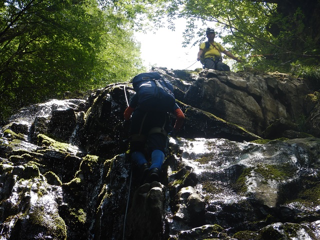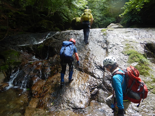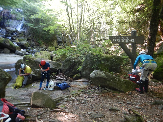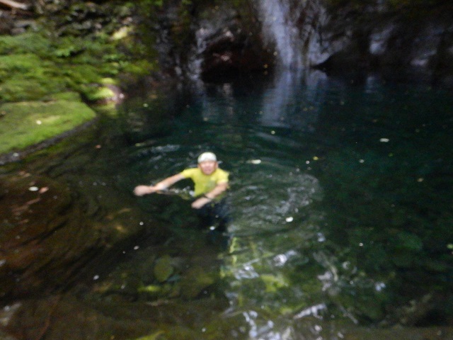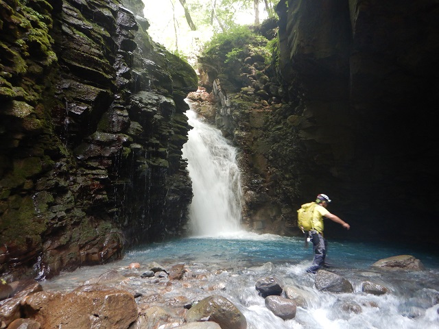 この先、ナメ状を進み、雷霆ノ滝(10m)は滝の左をロープを使い先ほどと同じ方法で登りました。今回の核心部の2滝をこえるとあとは、広いナメと小滝。ゴーロを1時間ほど進むと澄んだブルーの滝つぼ、おしらじノ滝に到着しました。ありさかさんは滝つぼにドボン!ウッチーは以前水の冷たさで溺れそうになったことがあるので止めておきました。