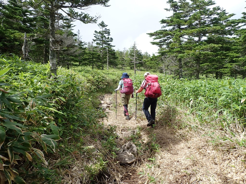 天祥寺原の上の分岐で、計画では双子池へ向かうことになっていたが、私が大河原峠へショートカットすることを提案した。ガレの下りからバテ状態が続いていて少しでも早く峠に戻りたかったのだ。