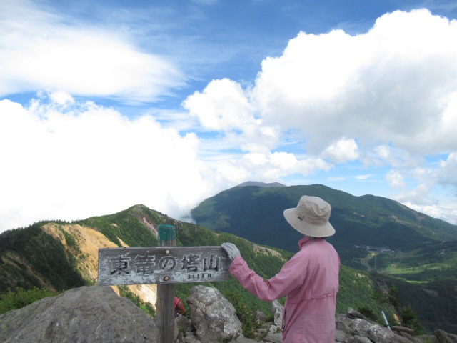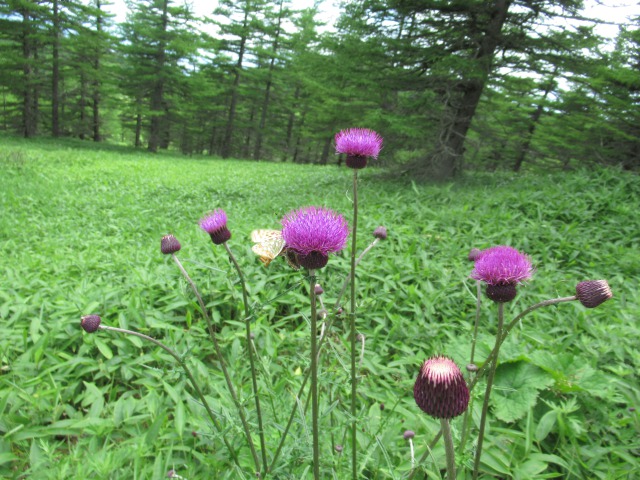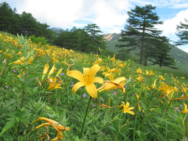 <詳細報告>夏の暑い時期になっったが、この所の天候はすっきりせず天気予報を何度も見ながらも、直前まで行き先を決められません。中央アルプス方面が良さそうですが、日帰りには少々遠いので、比較的近場で涼しい高峯高原を再訪しました。車坂峠のビジターセンター駐車場は満車、少し下のマウンテンパークに駐車し高峯山を目指します。前回はコマクサが丁度見頃でしたが、今回はすっかり夏の花に変わり、スキー場辺りはキスゲ、フウロやヤナギランで一杯です。鳥居をくぐり、ひと登りで緩やかな稜線歩き、クルマユリ、ウスユキソウなどを見ながらあっという間に高峯山に到着、祠に参拝し、高峯温泉経由で駐車場に戻りましたが、まだ昼前、車で池ノ平に移動し昼食、東篭ノ登山から浅間山火口など360度の展望と久し振りのマツムシソウを楽しみ、湿原に立ち寄りました。シャジクソウ、ノアザミ、シモツケソウ、トンボソウなど見られますが、以前より花の数は可なり少なくなった様に感じました。気温は20℃前後でカラッと爽やか、天候も良く色々な花々を楽しめました。