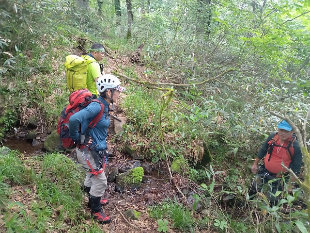 <詳細報告>南沢は阿武隈川の支流で、入渓口にある甲子温泉付近の駐車スペース車をとめ、装備を整えて出発しました。南沢の入り口は本谷と一里滝沢のとなりに水量の少ない沢がそれで、よく確認しないと見落としてしまいそうでした。入渓してしばらく進むと、F1が現れました。遡行図で調べてみると、10m前後の滝が遡行中10ヶ所ほどあり、F3以外の滝は直登可能とのことでしたので、そのほかの滝は9mm×40mのロープを出して直登して進みました。トップはありさか