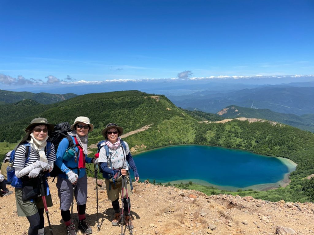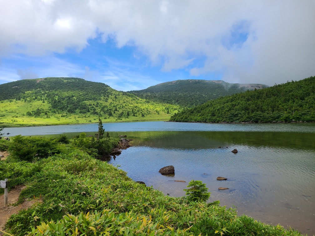 9時前駐車場に着くとほぼ満車状態。親子連れ、小さい子供を連れての登山者がとても多かった。ボッカトレのため重い荷物と強い日差しで序盤から滝のような汗が流れてバテバテだった。雲が湧いてきて山頂にかかり始めたが、お目当ての魔女の瞳はバッチリ見ることができた。コバルトブルーの鮮やかな色に見とれしまう。ミヤマリンドウはじめマルバシモツケ、クロマメノキ、オトギリソウなどのお花を楽しみながら鎌沼を周回して下山。マウント磐梯で汗を流して帰路についた。