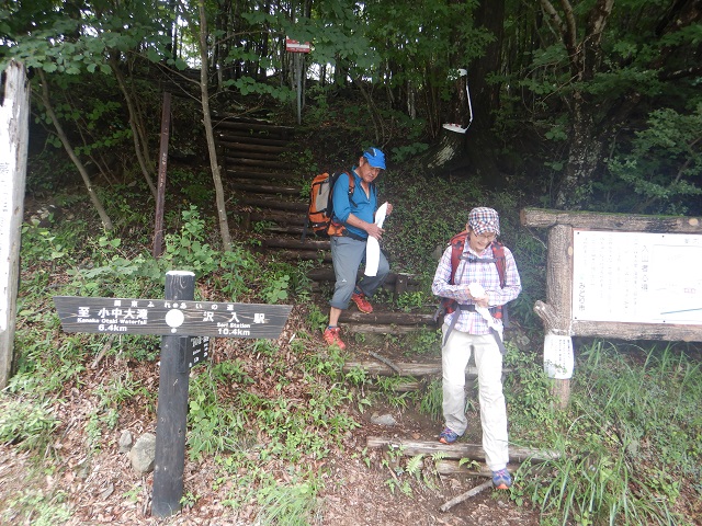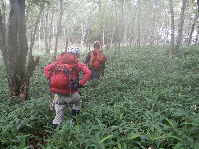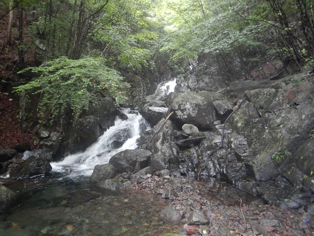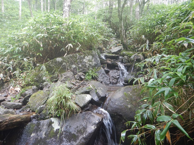 沢の中間あたりにある1:3の二俣を右に進むあたりから水量が少なくなり、小滝も落ち着いて沢が岩ばかりになってきたあたりでそろそろ沢も終盤、GPSを頼りに1530mあたりで本流から小沢にそれて登山道に向かいました。低い笹薮を15分ほどで避難小屋のある登山道と合流。沢装備を解除して登山道を折場登山口に戻りました。