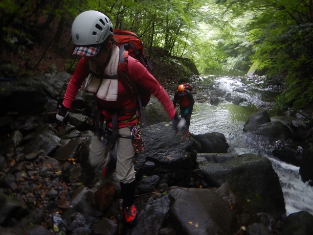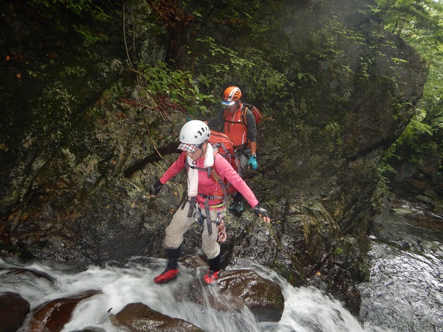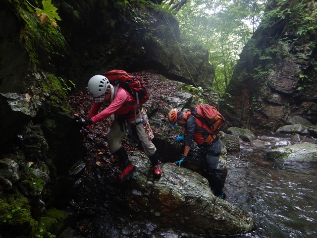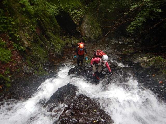 入渓してすぐに2m、6m、6mと滝が続いています。メンバーのなかの紅一点、ぐっちゃんは最初の連続の小滝を観て緊張を隠せない様子でした。F1からF8は連続していて、ときおり補助ロープやお助けスリングを出しながら5m前後の小滝を進んでいきました。
