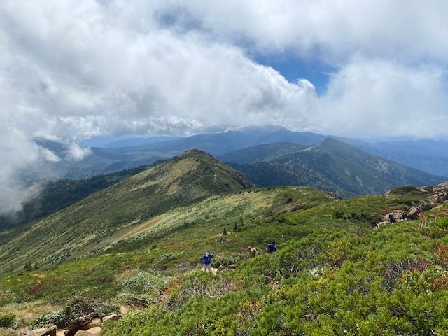 しばらくすると山の鼻に到着。一気にハイカーが増えた。ここで一服して、至仏山登りに入った。蛇紋岩という滑りやすい石があり、前日の台風と相待って、滑りやすいことこの上ない。800メートルの上りをほとんど休まずに一気呵成に山頂に到着。わんさか人がいた。お湯を水筒に入れてきたので、麺神シリーズのカレーうどん。うまし。人が多いので長居せずに小至仏山に向かった。ここからは山の様相が変わり、ゴツゴツとした岩がところどころあって、面白い。