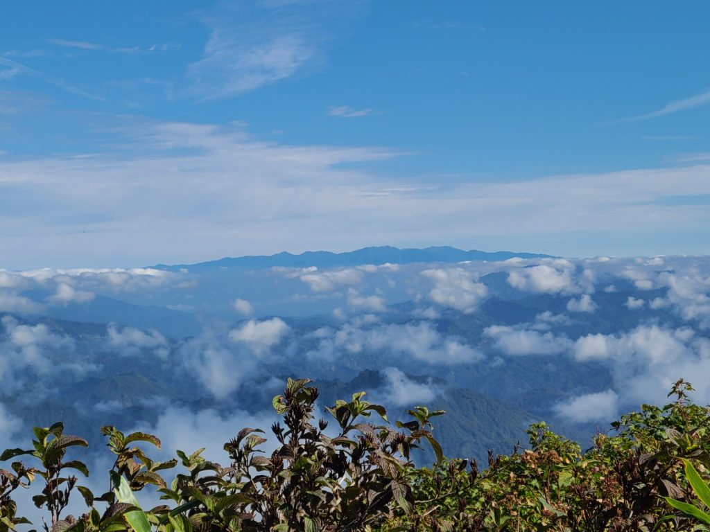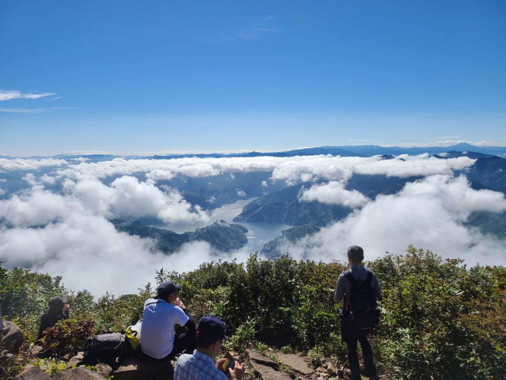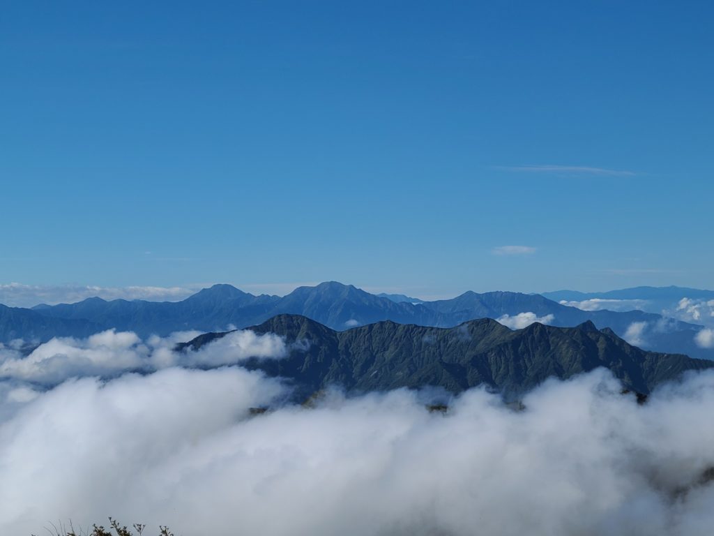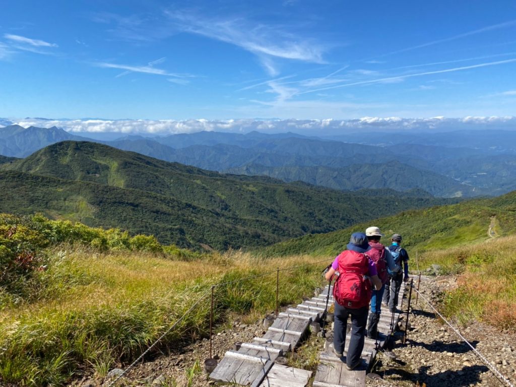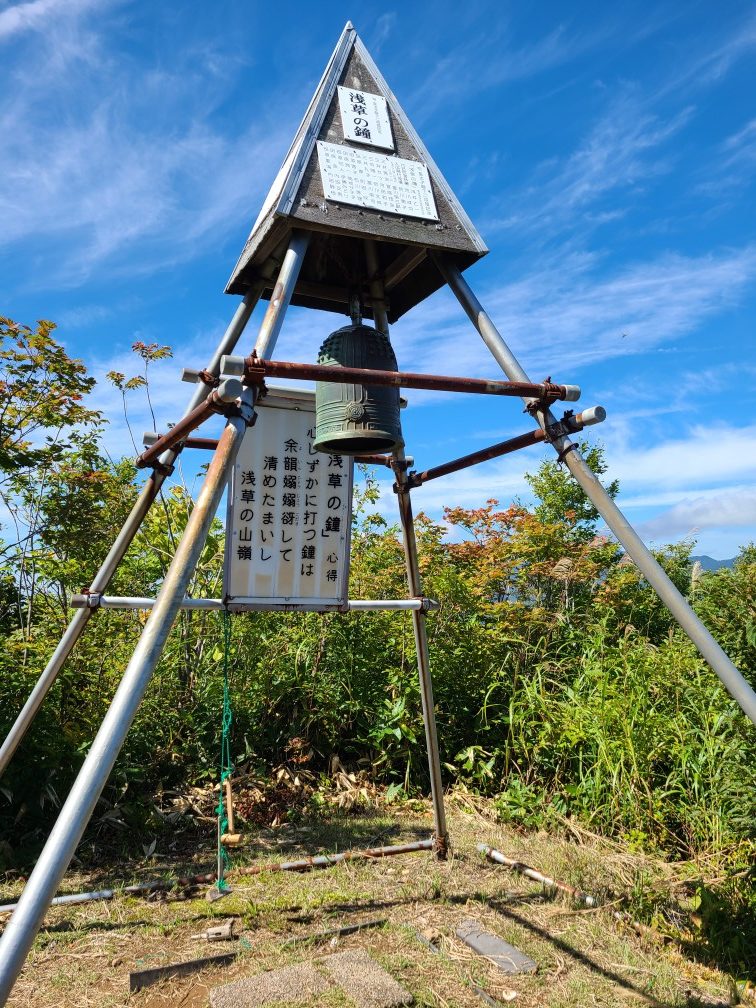 <詳細>先週の越後駒は暑さでばててしまいきつかったので、今回は軽めのコースを選択。24日夜ネズモチ平の広い駐車場に着くと誰もいない。このまま誰もいないわけないよねと言いながら就寝。朝起きて外を見ると反対側に1台だけ駐車していた。準備をしていると隣に停まった車がとちぎナンバーどちらから?と聞くと佐野市のとなり沢の方だった。登山道に入るとぬかるんでいて岩もあり滑らないように慎重に歩く。急坂を登り前岳の手前で視界が開け笹原の木道に出る。木道が斜めに傾いていて歩きづらかった。9時前に山頂に到着。雲海が広がり越後三山、守門岳、飯豊山、燧ケ岳等々360度の展望。山頂で1時間以上景色を眺めていた。下山は桜曾根、風が心地よく吹き展望を楽しみながら下山できるコース。桜ソネ広場手前に浅草の鐘があり心得「心しずかに打つ鐘は余韻嫋嫋谺して清めたまいし浅草の山嶺」とあった。各々が心に留めて鐘を打った。アスファルトの林道に出て駐車場まで戻った。駐車場は前夜が嘘のようにたくさんの車があった。入広瀬の寿和温泉(700円65以上400円)で汗を流し帰路についた。
