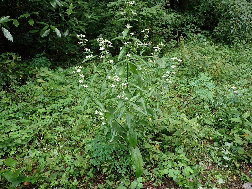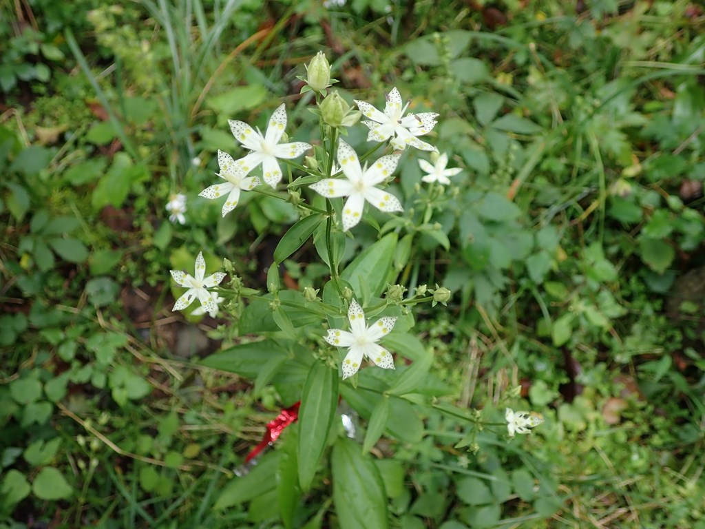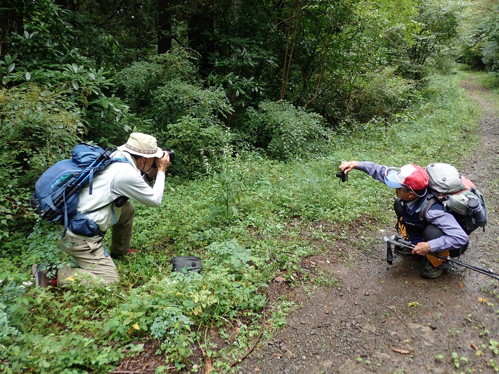林道を東に進むと、道端には秋の草花がたくさん花を咲かせている。やがて、アケボノソウが咲いている場所についた。ネットの写真しか見ていないので、もっと大きな花弁を想像していたが、小さく可憐な花だった。株は少ない。最近は盗掘が多いそうだが、花は移植しても環境が変わると花を咲かせないので、その場に置いておいてほしいものだ。そうすればたくさんの人が楽しめる。
