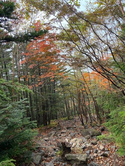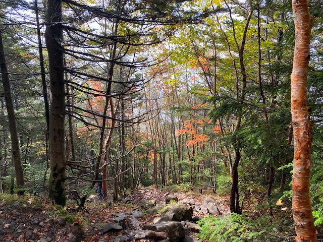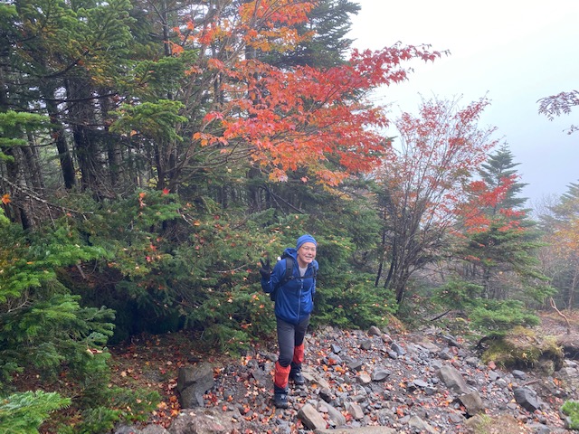 6時30分に雨も上がり周囲もみえるようになったので登山開始。整備された登山道で、傾斜もきつくなく登りやすい。初めは笹の間を縫うように進むが、そのうちにしらびそなどの針葉樹と苔の道となる。徐々にゴロゴロとした岩が現れ始めると、紅葉した木がたまに登山道に現れ始めた。赤い色が目立つがたまに黄色もあり。それらの木々の下で撮影。そのうちに風が強くなってきて、大きな岩場に差し掛かる頃には霧雨と強風のために視界も悪くなり、メガネが全く役に立たなくなった。