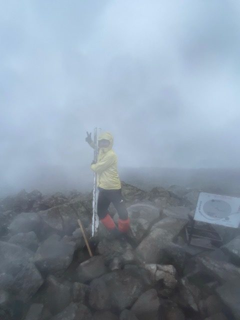 山頂に分岐するあたりからは連れの細身の女性は耐風姿勢を取るなどして、ようやく山頂到着。急いで写真だけ撮って下山開始。大きな岩場を越える頃には急激に風も止み、あれは一体なんだったのか、天国と地獄だねと言いつつ下山。岩が濡れているので、やや晴れ間が見えてきたとはいえ、滑らないように非常に気を遣う。前方が開けたところで、ガスも取れると、紅葉はあまりないが、周りの山々も見えてきて気分も晴れた。登りの登山者には山頂近くの強風と霧雨のことを伝えて、雨具をその前に着た方がよいですよとアドバイスした。