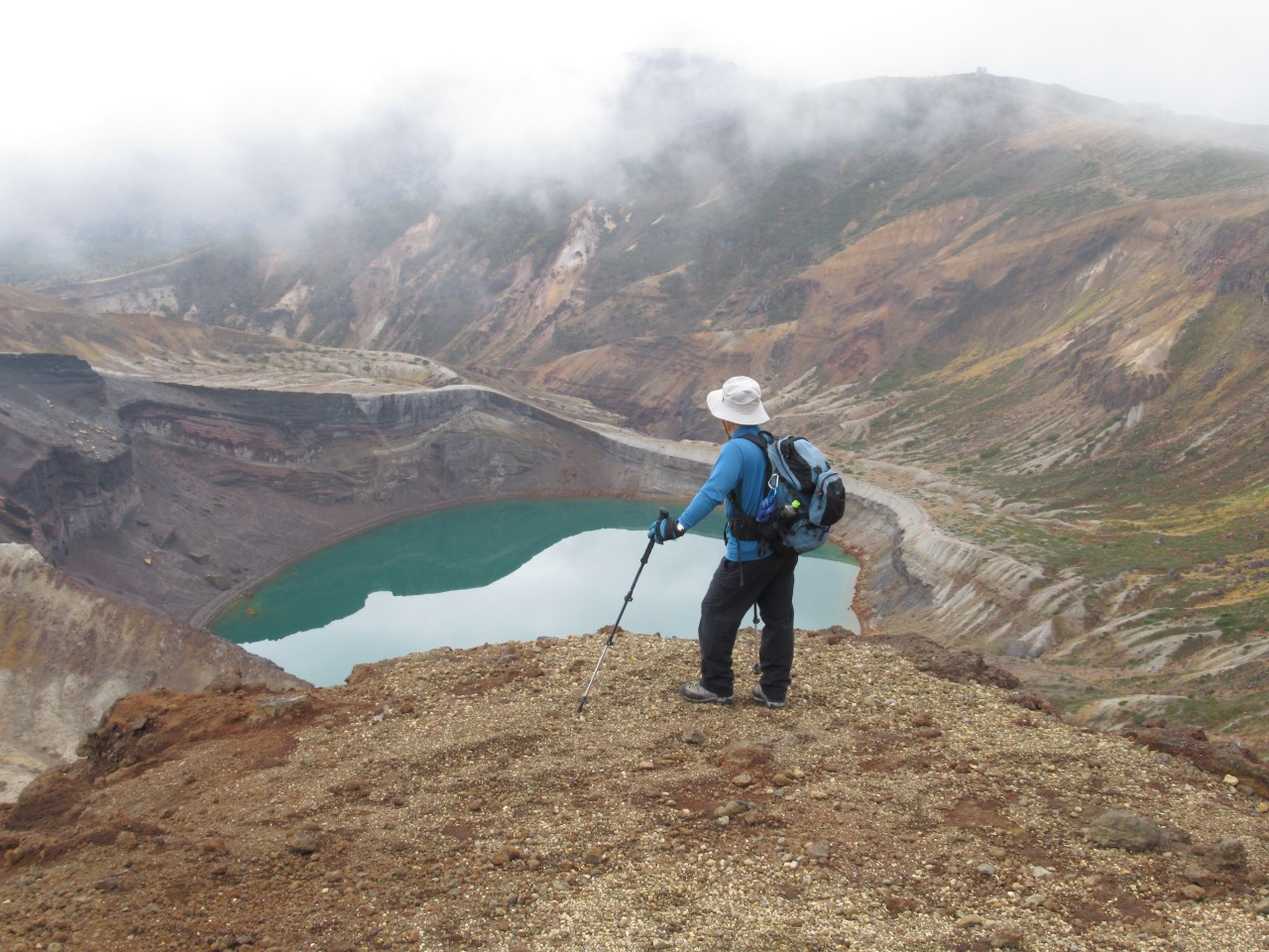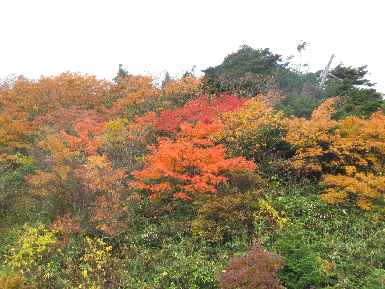 <概要>天気予報に反してガスが立ち込め山頂周辺は真っ白、朝の内時々晴れ、エコーライン上部の紅葉、お釜と山並みが見られ、蔵王温泉秘湯に浸かれたのが救いでした。