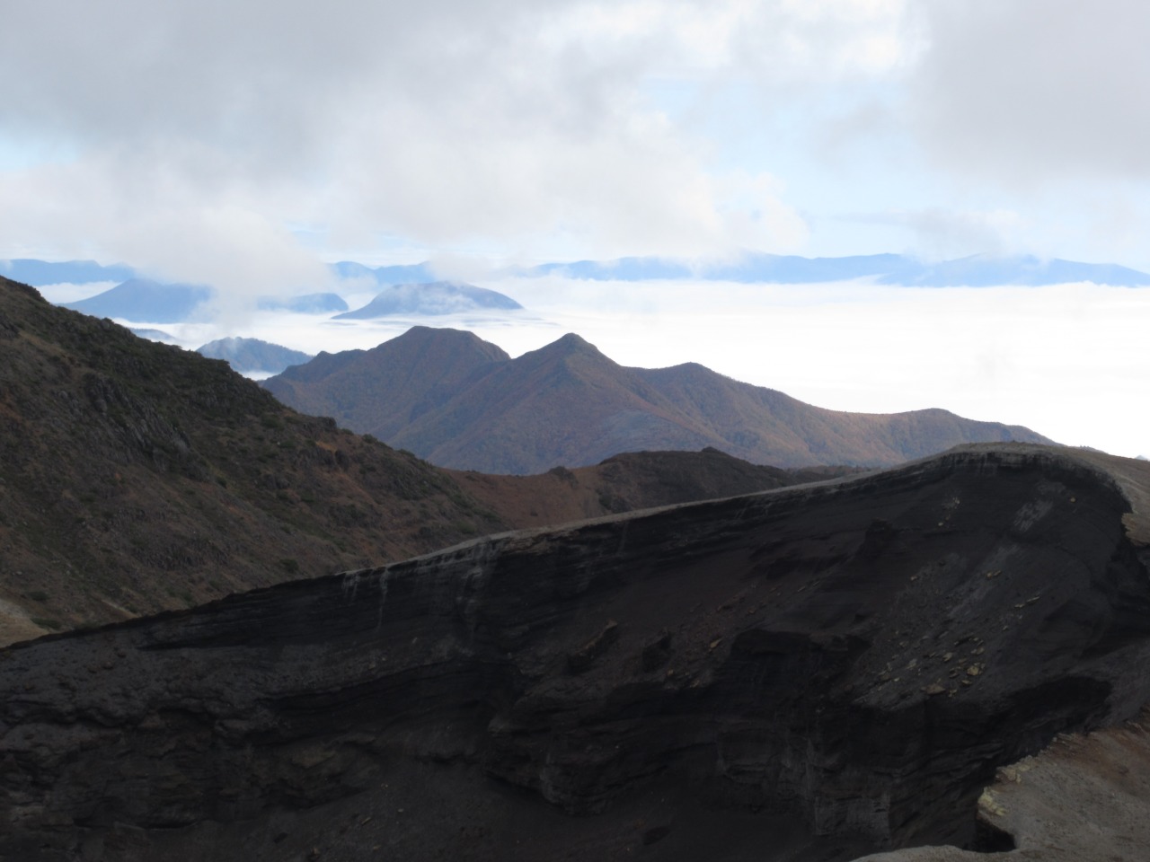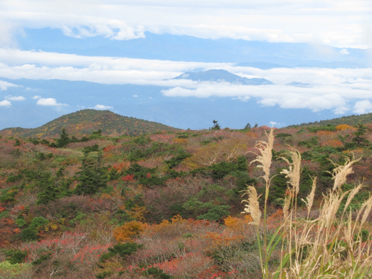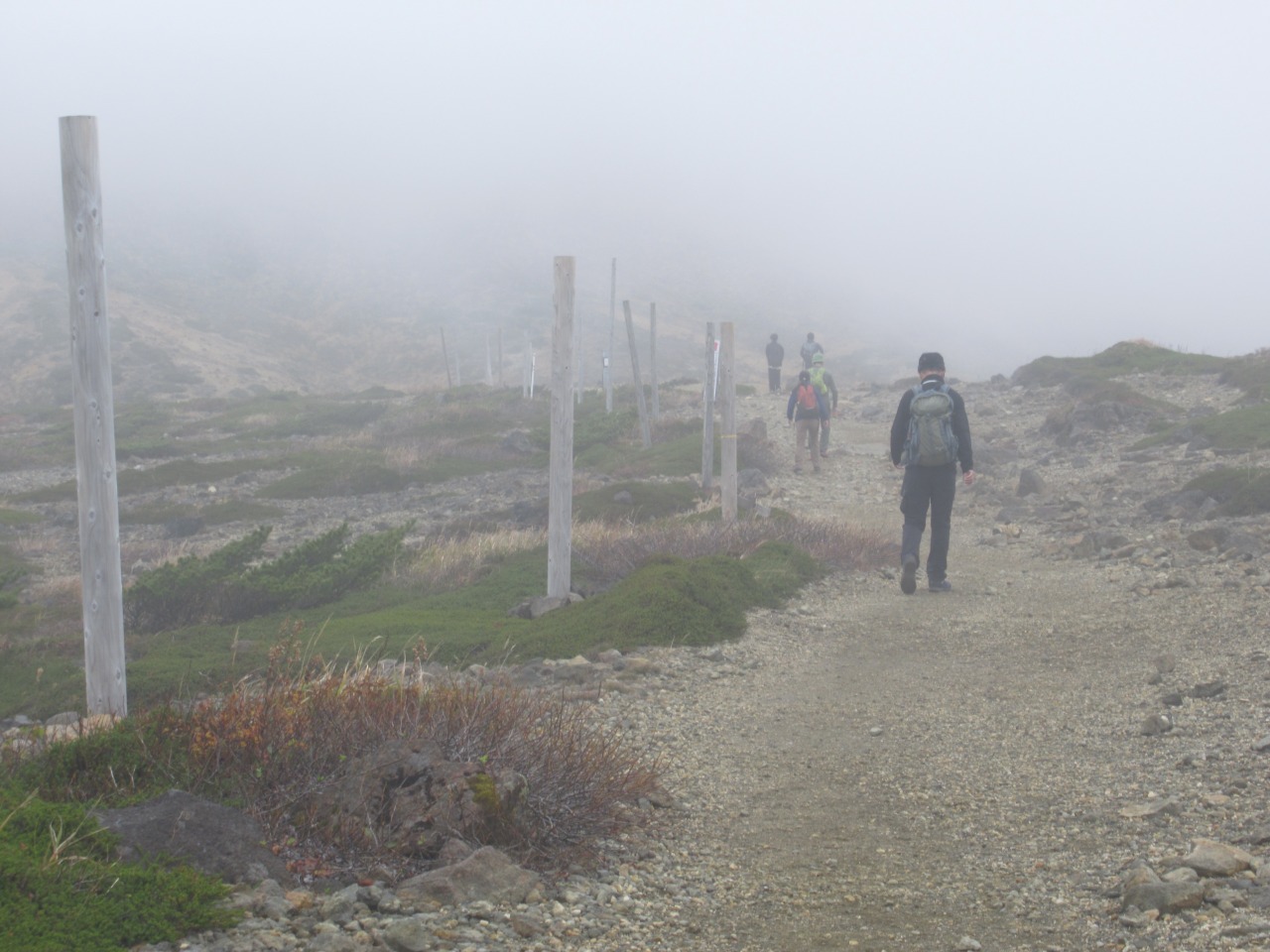 <詳細報告>このところの天候は不順、紅葉の時期を逃してしまいそうで、平日でしたが天気の良さそうな東北方面に出掛けました。紅葉はエコーライン上部が盛りで、中腹、麓はまだこれからといったところ、所々鮮やかではありますが、赤茶けたところが多く当たり年ではなさそうです。レストハウスに着いた頃は熊野岳山頂も見えていましたが、歩き始めた頃にはガスが掛かり一面真っ白です。馬の背から避難小屋辺りでガスが取れ、お釜と周辺の山が見え、これから晴れて来るのかと期待しましたが、結局晴れたのはこの時限りでした。熊野岳山頂もガスで登山客も疎ら、ひっそりしています。近道で地蔵山に向かいますが、視界が効かず、平らで石が多いので踏み跡も無く道迷いしそうで、岩上のペンキ○マークとGPS、地図を頼りに幹線登山道に合流しました。地蔵山手前のワサ小屋跡と山姥のお地蔵様の解説を読み地蔵山で大休止しましたが、ここもガスで真っ白で眺望は全くありませんでした。往路を戻り下山しましたが、時間も早いので、山形側に下り、蔵王温泉の硫黄泉秘湯大露天風呂にのんびり浸かり帰宅しました。