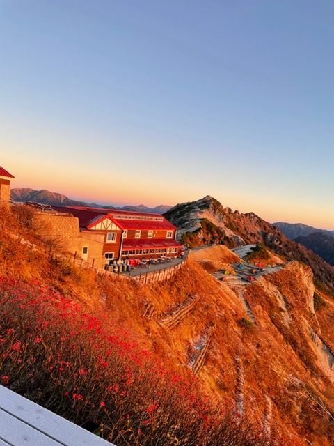 部屋で休憩していると、夕焼けが凄いと小屋のスタッフもカメラを持ち交代しながらシャッターを押していて、今日のような素晴らしい天候はこの所ないとのこと。