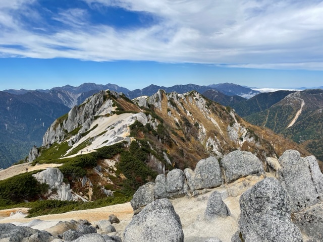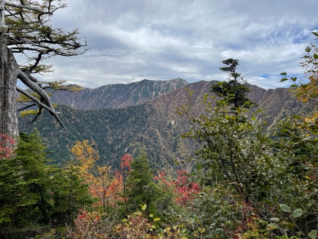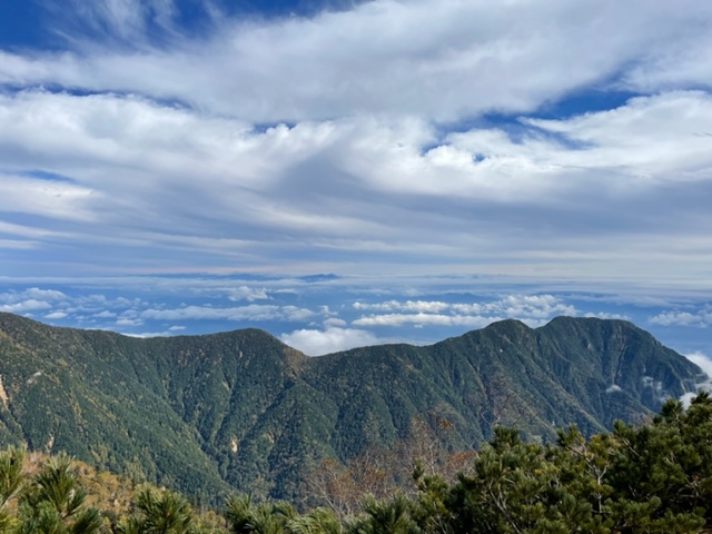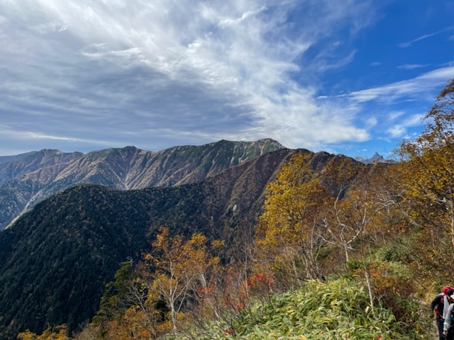 2400m付近の登山道から表銀座稜線の向こうに白い雲と青空の中、槍の穂先がはっきりと見え感激した。空気が澄んでいるので、合戦ノ頭(2488m)付近からも西方の稜線の眺望が良く、槍ヶ岳や大天岳の山々そして大天荘も望め満足だった。