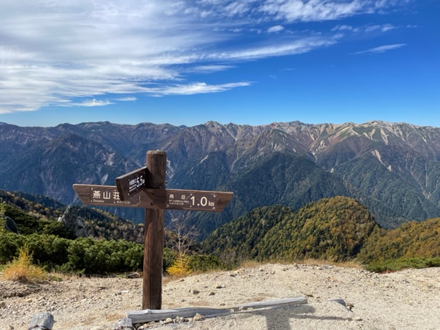 <概要>昨年8月燕岳登山計画をしていたが、8月13日から中房温泉に行く道路が通行止めになり、登山中止となった。今回お互いの予定があったので、リベンジすることにした。登山前日は有明荘宿泊、中房温泉周辺の紅葉は気温が高めだった為、これからとのことだった。第一駐車場に一台だけ空きスペースがありラッキーだった。久しぶりの急登に身体は重かったが、合戦小屋に着く頃には身体は軽くなりホットする。燕山荘に到着すると素晴らしい景色が待っていた。暑くも寒くもなく風も無いベストな登山日和に恵まれ、ここでしか見ることのできない北アルプスの素晴らしい眺望を楽しんだ二日間だった。有明荘、燕山荘でも全国旅行支援が受けられた。