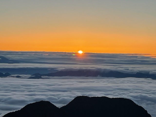 14日 4:40起床、朝日を見るため外で待機、5時過ぎには東の方角が明るくなり始めた。日の出5:55頃雲海上に太陽が現れ感動する。北アルプスの山々にも日が当たり(モルゲンロート)赤く輝いていて凄く綺麗だった。