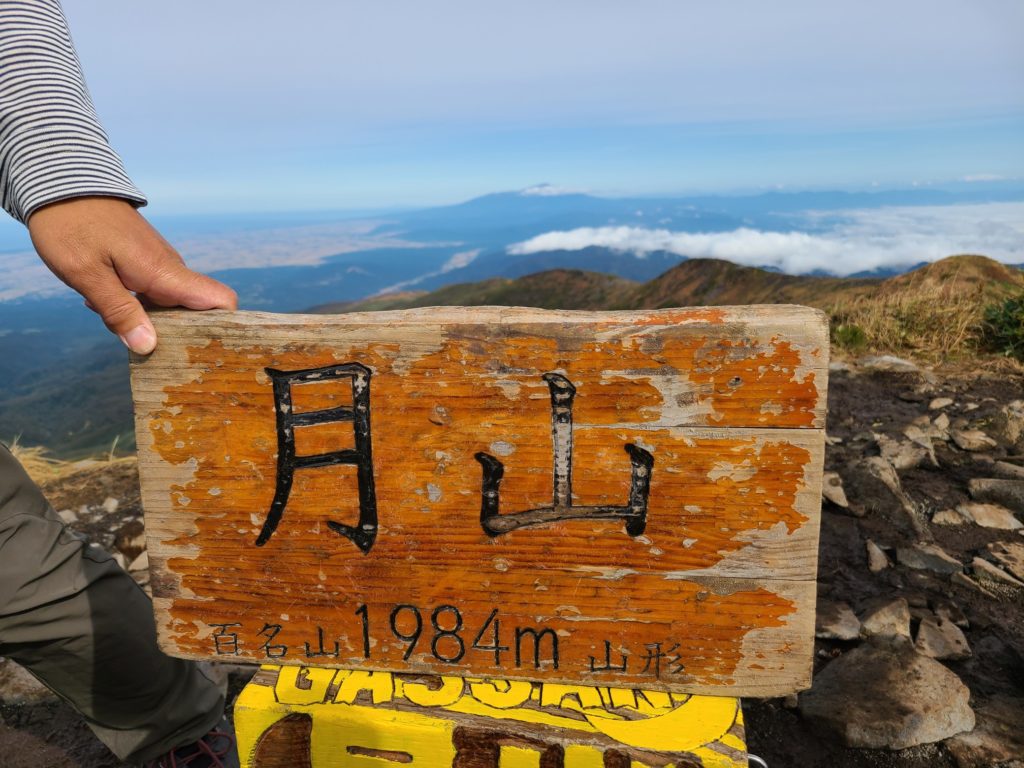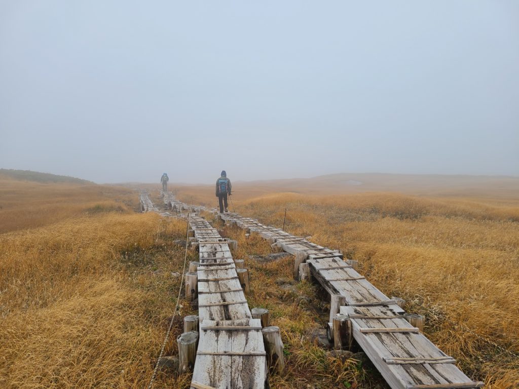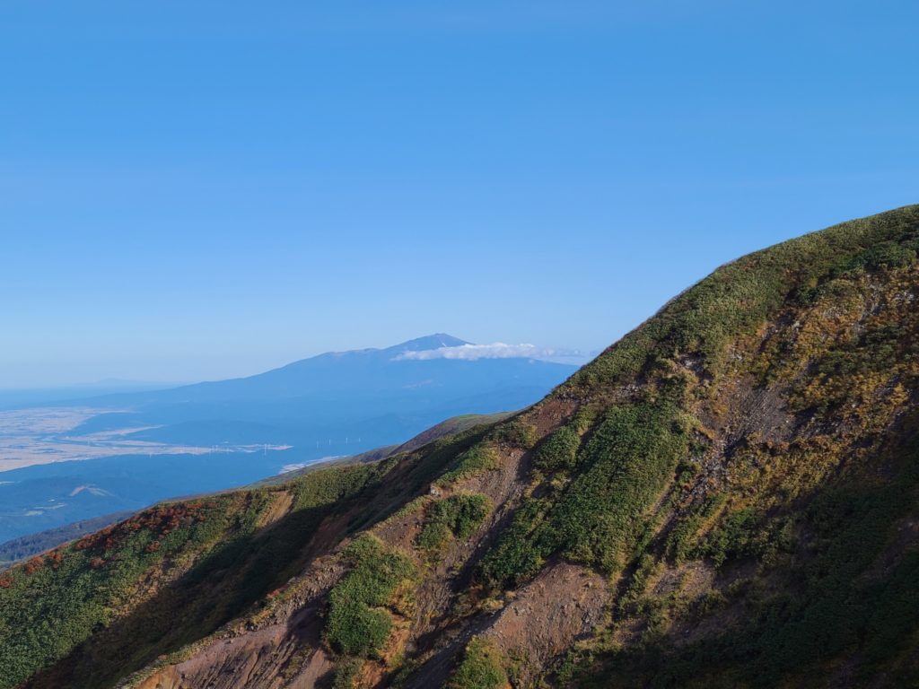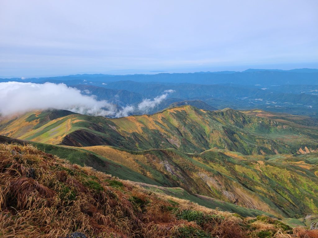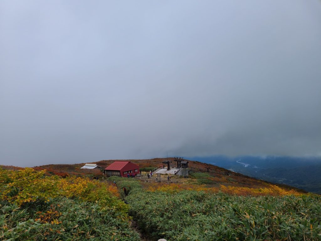 翌朝6時ごろ駐車場に着くと続々と車が入ってくる。リフトは8時からなので入山協力金200円を払い登山道に入る。前の日降った雨で道が濡れていて滑らないように気を付けて歩いた。歩き始めてすぐに暑くなり上着を脱いで薄着になった。樹林帯を抜けると青空に草紅葉が映える。山頂まで色づいていて美しい。牛首からは鳥海山や日本海の眺められた。そこから急登を頑張り1時間ほどで山頂へ。朝日岳方面は雲海が広がりその上に頭をのぞかせていた。神社で参拝して裏側の山頂へ、山頂識の順番待ちがあったがすぐ撮れた。間もなくガスがかかってしまいあっという間に真っ白になってしまった。一気に寒くなり持っていた防寒着を着こんでも寒くてお昼もほどほどに下山開始。牛首までリフトで上がってきた登山者で渋滞し、すれ違いでかなり待たされた。姥が岳方面に向かうと人が少なくなった。稜線は風が強くとても寒い。姥が岳山頂からほどなくリフト上駅到着。紅葉が見頃だった。下りはリフトで楽ちんです。帰りにかしわや(500円)で身体を温め弓張パークプラザでテントサイト利用料金を支払い帰路についた。渋滞があったので黒磯板室で高速を降りて下道で宇都宮に戻った。