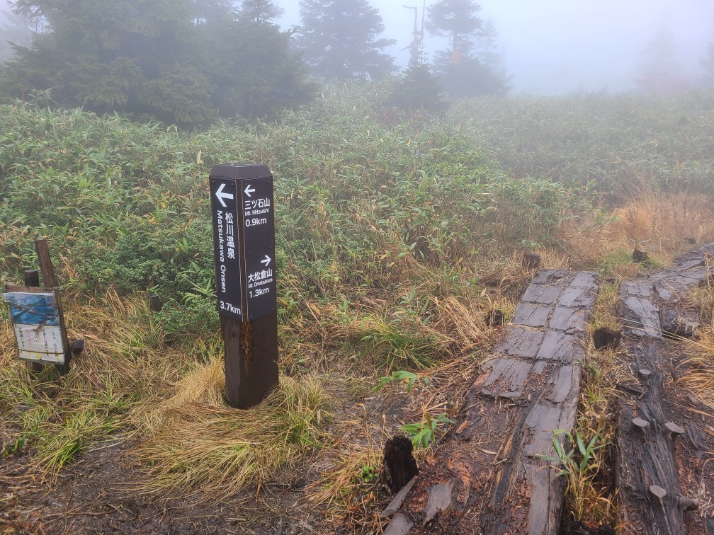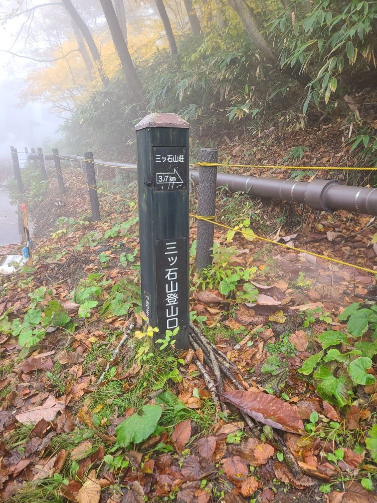 朝目覚めると雨音がする。えー、天気は良いはずだったんじゃない?松川温泉まで移動し雨具を着て天気の回復を祈りながら出発した。登り始めは少しだけ岩手山が姿を現したが高度を上げるにしたがって真っ白なガスの中。源太ケ岳では風も出てきた。気持ちの良い稜線のはずなのに何も見えない。小畚山手前で今日初めての登山者に出会う。青年は安比高原から縦走してきて今日は岩手山八合目まで行くという。彼も私たちが今日初の登山者と話していた。景色が全く見えないのでただ黙々と歩くだけ。三ツ石山に着くと反対側からの登山者で賑わっていた。こんな日でも来る人はいるんですね。ここから三ツ石小屋までは岩と泥んこ道で慎重に下る。三ツ石小屋は人気の避難小屋で紅葉時期は混雑するようだ。中には薪ストーブがありきれいな小屋だった。先に行った青年が現れ滝上温泉の方に下りて行ってしまい30分ロスしたと言って八合目方面の道へ足早に去っていった。小屋の外で休憩して松川温泉へ下った。泥んこ道と長い階段で、こちらから登るのも大変だなと思った。少し日が差し中腹は紅葉が見頃で日が当たるとやはり美しい。もう本当にがっかりの三ツ石山であった。また来いっていうことだよということで来年のリベンジを誓うのであった。