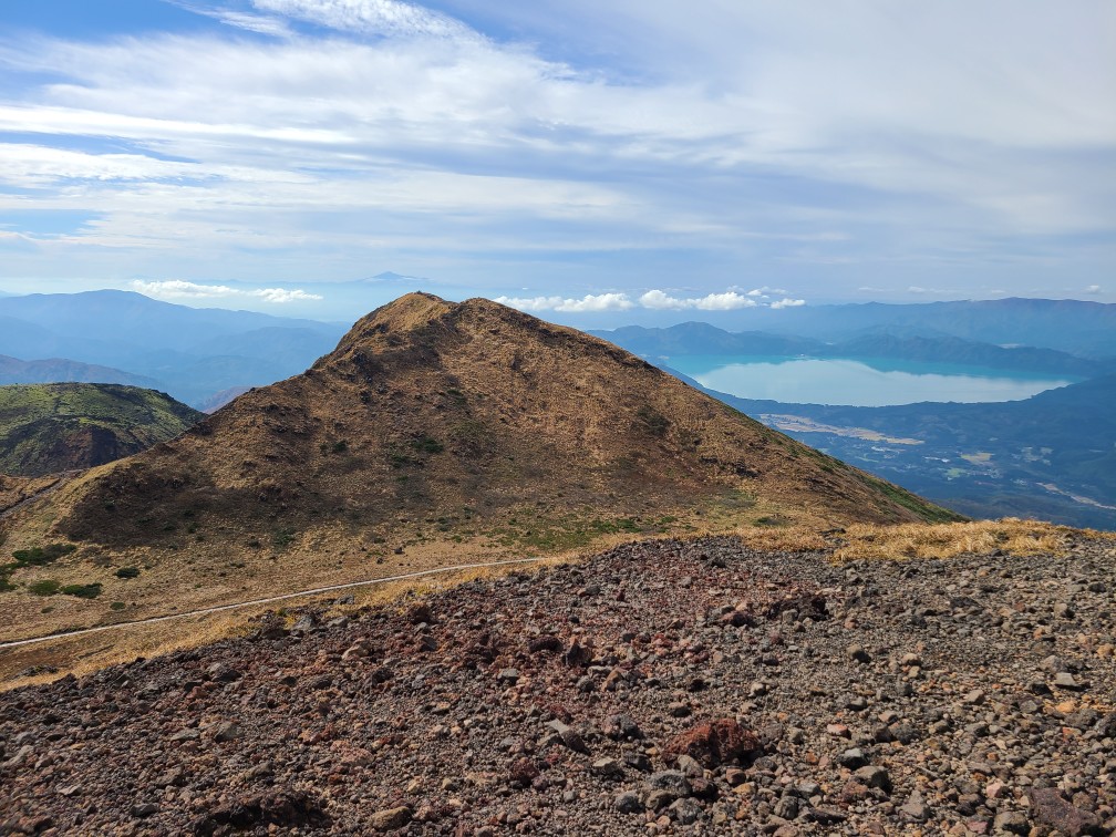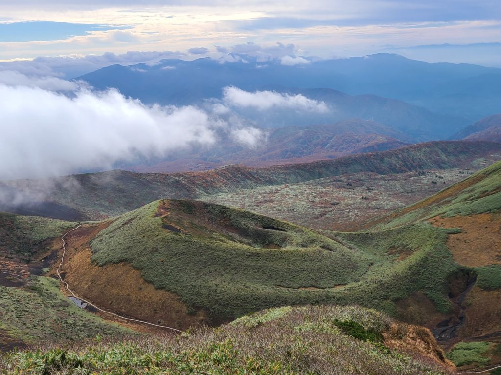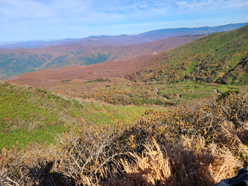 前の日のがっかりだった三ツ石山から一転、秋晴れのよい天気。アルパこまくさからのシャトルバスの中から見る紅葉が一番の見頃だった。バスを降りて登山開始。展望スポットから北側は雲もなく遠くに岩木山や森吉山、昨日寄った玉川温泉の噴煙の上がる焼山 八幡平 三ツ石山の特徴ある岩もよく見える。乳頭山もかっこいい。片倉岳展望台からは田沢湖 大平山 鳥海山も見え素晴らしい展望だ。阿弥陀池に着き休憩した後、一気に男女岳へ登る。前回もきつかったが今回もここの登りはきつい。山頂から南方面に昨年登った和賀岳の姿が、その左手に焼石岳がみえるわけだが雲海の中だった。素晴らしい展望に感動しっぱなし。しばらく景色を堪能し阿弥陀池に下り横岳に登り返した。そこからは女岳 ムーミン谷 小岳 パッチワークのように色づいた横長根の稜線が見下ろせた。女岳はおっかーが小学生のころ噴火をして夜田沢湖に噴火を見に行ったそうだ。田沢湖も噴火を見る観光客で賑わっていたと当時の様子を教えてくれた。横岳に来るとガスが上がってきて焼森はまた真っ白に包まれてしまった。八合目方面に入るとまたガスも晴れて快調に飛ばし登山口に着いた。登山口に靴洗い場があり三ツ石山で泥んこになった靴を洗った。バスに乗りアルパこまくさに戻ると温泉はボイラー故障で入れないとのこと、乳頭温泉にあるおっかーの友人の宿蟹場温泉まで行くことにした。その前に田沢高原の穴場のパスタやさんでランチ、そこでの地ビールが美味しかった。乳頭温泉へのブナの道の紅葉が見事でおっかーはここのブナの道が大好きだと言っていた。蟹場温泉ではおっかーも久しぶりの友人との再会でとても嬉しそうだった。湯の花のある芯から温まる温泉で次回は泊まってみたいと思った。温泉を出たのが16時近く、あねっこ道の駅で買い物をして盛岡から高速に乗り帰路についた。佐野到着は22時40分。時間も遅かったので渋滞なく帰れた。