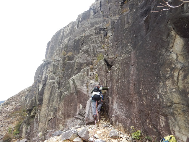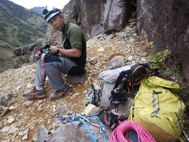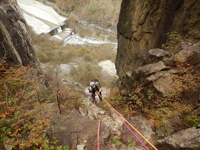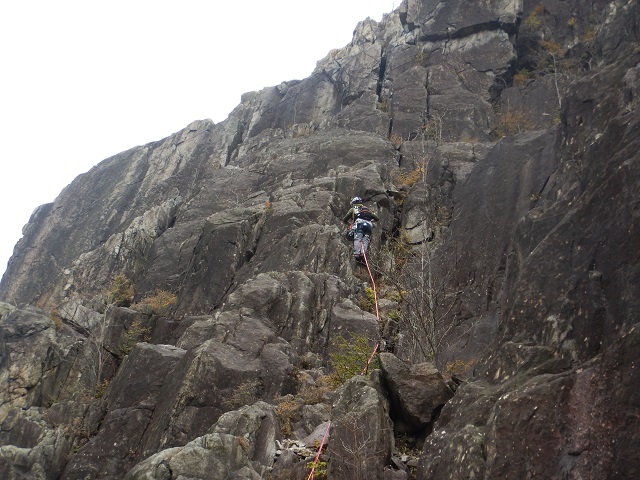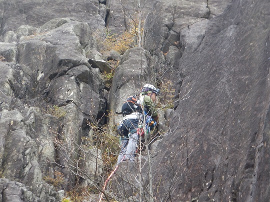 次に登るルートを思案しているとしていると、登攀を終えた先ほどとは別のパーティーと会い、ルートなどの情報をもらいました。それで1本目のとなりにルートがあることを教えていただき、2本目にそのルートを登攀し、途中で懸垂下降で降りました。