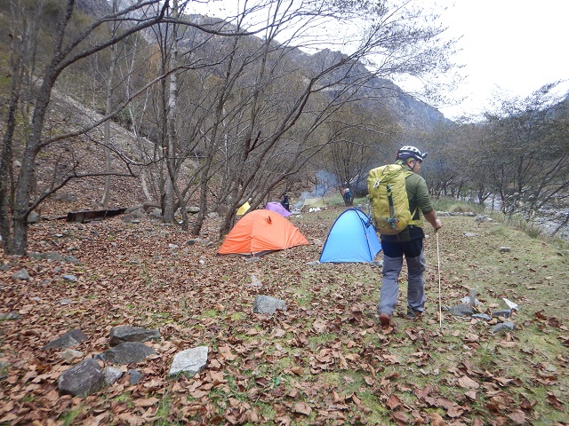 下山は朝とは違う岩を積んだ目印の踏み跡を下りました。途中、川の沿いにテント場があり、焚火をしていました。ここでテントを張って、泊りで来るのもいいな。次回の松木沢ジャンダルムが楽しみになりました。帰りは入浴する適当な施設が見つからず、仕方なくそのまま小山に帰りました。