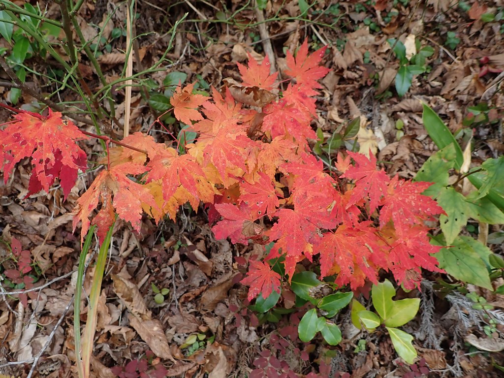 南に少し舗装道を進むと耕作地があり、ブドウと野菜(くりさんによるとニンニク)が植えられていた。そこで林道は左に折れて尾根に向かう。林道の谷側は最初は杉林だったがやがてカラマツ林となる。標高600mを過ぎたころにまた杉林となった。しかし、林道の左側(尾根側)はずっと広葉林で紅葉盛りだった。黄葉が多いが。林道終点は広くなっていて、そこで小休止した。見上げると青空に黄葉が映えていた。