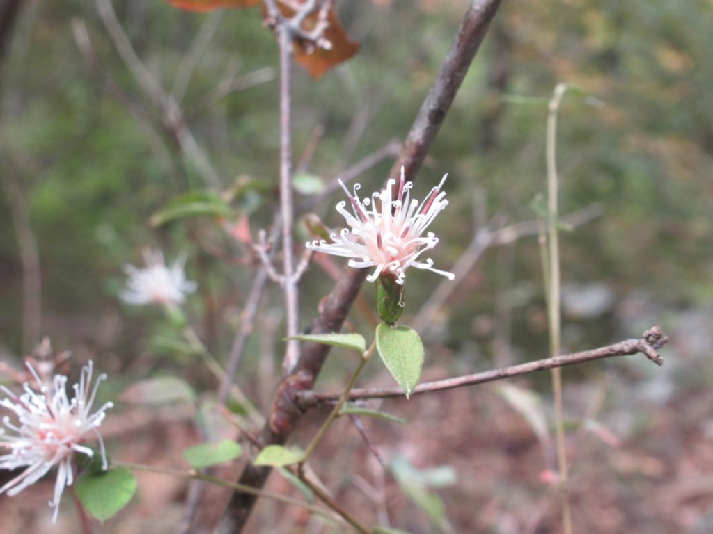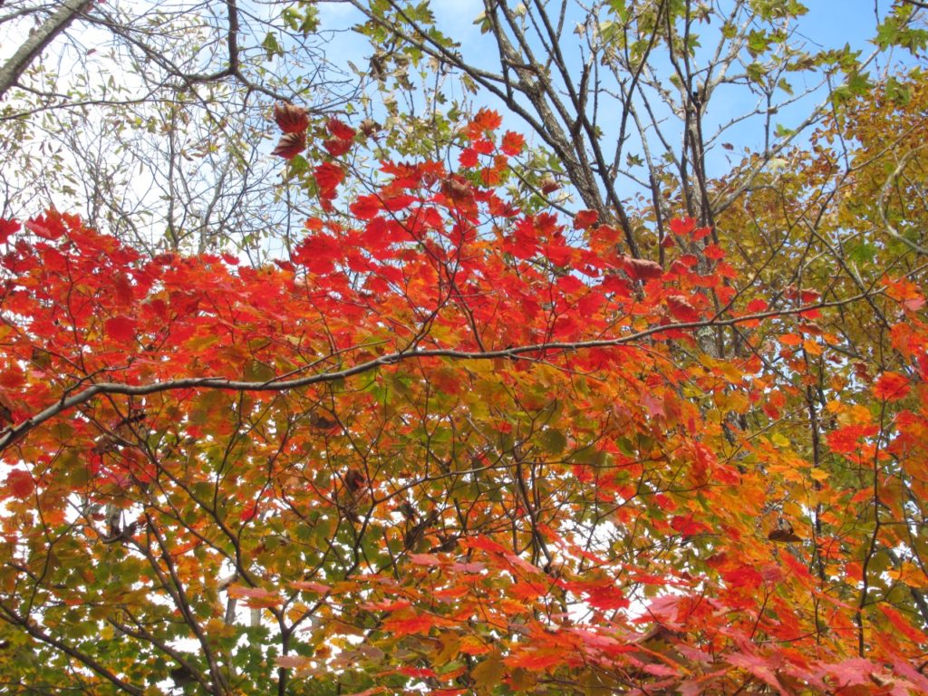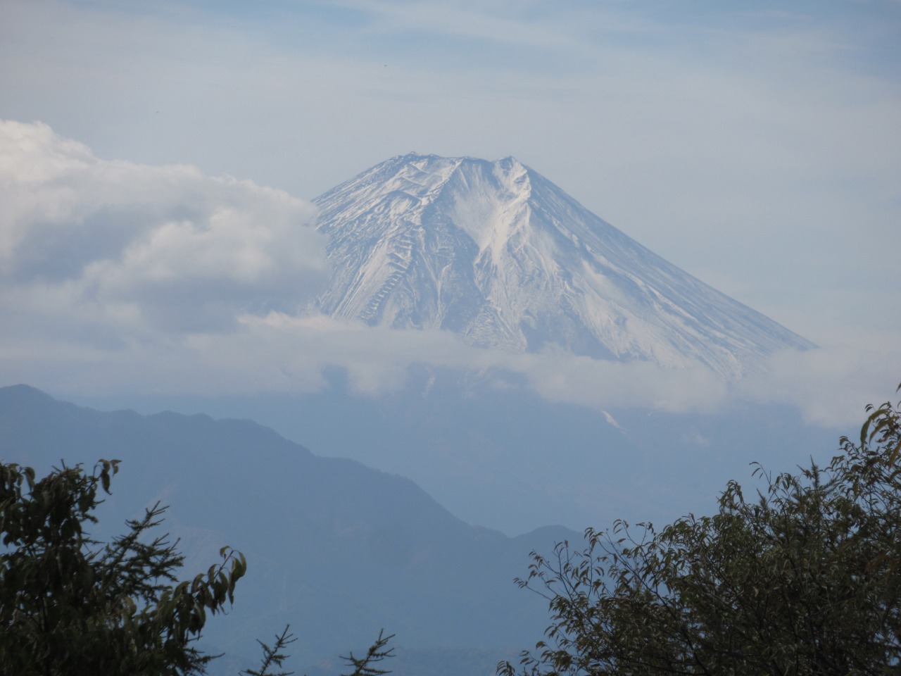 <詳細報告>この所天候に恵まれない山行が多い。9月25日に霧雨で撤退した大月市富嶽十二景 六番”扇山”にリベンジマッチで出掛けました。8時前に梨ノ木平に駐車場に着きましたが、短時間で登れ、電車でも来られるためか、駐車場は私達の後に1台来ただけ、地元の方が登山道を掃除するらしく数名の方が集まり始めていました。傍らのお地蔵様を拝み、標高1,000m付近までは杉林の中、良く整備された、広く歩き易い登山道です。落ち葉も多くありますが、コウヤボウキ、マツカゼソウなどの花もまだ咲いていました。山頂付近で所々紅葉が始まっていますが、まだ時期は早い様です。広い公園の様な山頂は閑散として、南西方向に開けた所から富士山がドカンと見えますが、雲がかかり始め、暫くすると姿を隠してしまいました。下山時多くのハイカーとすれ違いましたが、残念だったでしょう。下りはツツジ新道を降りましたが、踏み跡が薄く、急で、尾根筋を外さない様気を使いました。
