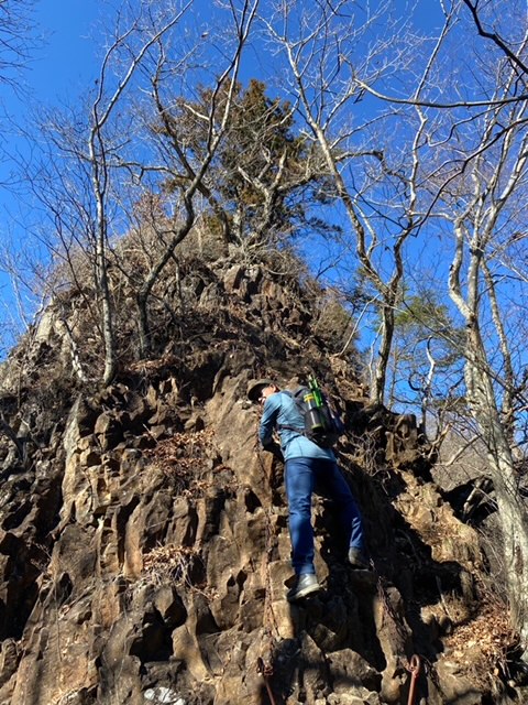 経塚山山頂まで登ったら今度は急激な降りで下降点までゆき、長い鎖のある岩場を経て、西立岩山へ到着。ここでランチとした。日清カップラーメンカレービッグサイズで定番の味。妙義山などが良く見える。風もなく日向は暖かい。ここから降った登り返しがきつかった。先ほどの経塚山入り口までの降りはチェーンスパイクで、やはり安心だ。ここから艫岩展望台まではずっと平坦で、避難小屋を過ぎ、ヘリまで行くと絶壁となっていた。艫岩にはロープで立ち入り禁止となっていた。ピストンで星尾峠に戻り、行きとは違うルートで駐車場へ。天気良く人とあまり出会わない静かな山行となりました。