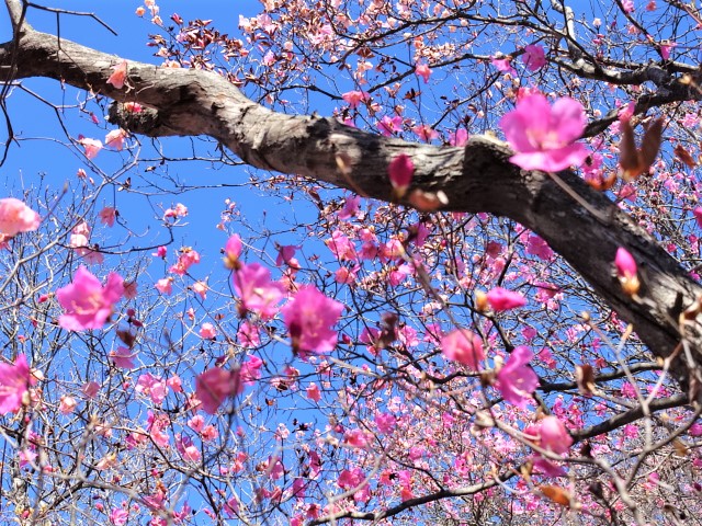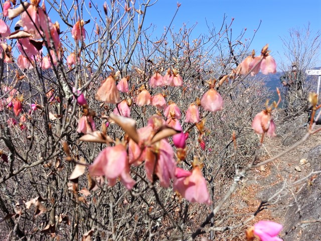 今年は近隣の低山での赤ヤシオの咲具合がいいので、西上州の低山はさぞかし良いかとの期待をして三ツ岩岳を訪れた。人気の山、さすがに駐車場は満杯、100M手前に路駐しダム湖脇を出発。天気は快晴なれど風は冷たい、三ツ岩の周回だけでは少し軽めになると思い時計と反対廻りを選ぶ。いきなりの急登が続く、稜線まで上がればホットする。一帯はヤシオが随所に出てきた。だが、想定外の誤算である。1~2日前からの寒さで霜が降り満開のヤシオが台無しだ。