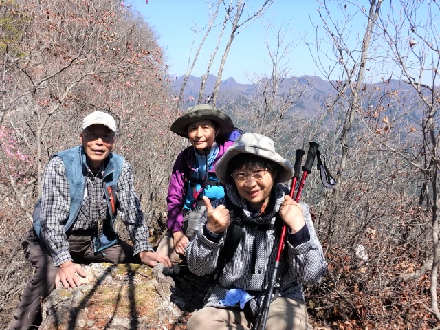 今日の目的の一つ、大津への稜線を行けるところまで、と初めてのルートを行く。静かな尾根筋はふみ跡は薄いが藪はない。徐々にやせ尾根となり厳しくなってきた。ピーク直下ではザイルで挑んでいる2人連れが見えた。急傾斜で微妙な岩尾根を辿るが、新人同伴のため、あまり無理はできない。ピーク直下20mほどのところで打ち止め、下山する事にした。狭くて荷物も置けない場所で下山準備、チェストハーネスを着け補助ロープを出す。なんせ新人さん初めての経験、大事を取り確保しながら慎重に行動しました。低山でもハーネスと補助ロープは必携です。帰路の集落の桜を始め色とりどりの花に目を奪われ、ヤシオは残念だったが、景色と変化を楽しめた山行となりました。