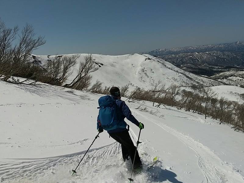 風、快晴の北品倉尾根の山スキーを楽しんだ。雪質も新雪混じりで良く滑り、去年は