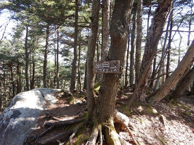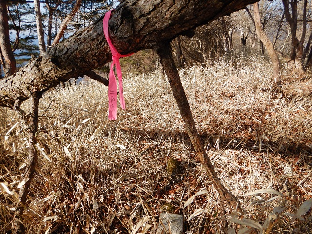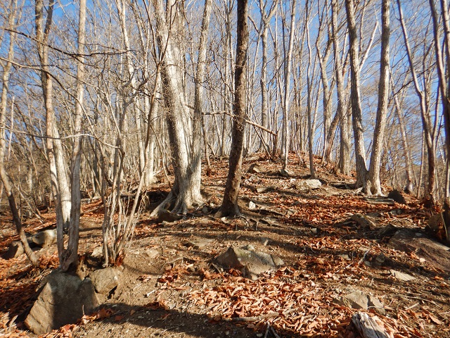(登山口~半月山)登山口は林道終点、並行して流れる深沢を渡り登山道の先にある赤倉山から延びる主尾根でした。ですが、赤テープに惑わされて、結局谷筋からの急な斜面からの取付きになってしまい苦労しました。主尾根はなだらかで低い枯れた笹の上を歩くので苦ではありませんでした。赤倉山は広い笹の草原のようで、山頂の看板が見つからず、三角点を確認しただけでした。あちこちに鹿の糞が散乱しており、時々鹿の群れに驚かされました。尾根の途中広い登山道に合流。子の登山道は半月峠まで続いているようでした。私は林道通りには行かず途中から、正面に見える半月山を目指しました。道のない尾根をたどると策が現れ半月山駐車場に到着。その先の低い笹の急斜面を登りきったなだらかなピークが半月山でした。