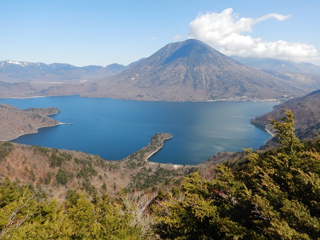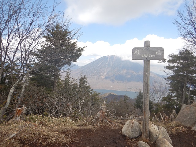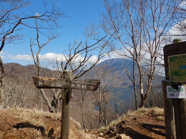 (半月山~社山)半月山は樹林帯の中の展望のないピークでしたがその先にある展望台では中禅寺湖の先にある男体山が素晴らしい眺めで、つい見とれてしまうほどでした。この先の稜線歩きは時々見える周囲の景色を眺めながら半月峠、中禅寺山を越えて阿世潟峠と順調に進みましたが、さすがに阿世潟峠から見上げる社山は登りがきつそう。「ここから林道を使って下山しようか・・・」心が揺らぎました。気を取り直して約1時間で社山に到着。行動予定の大半を終えホッとしました。