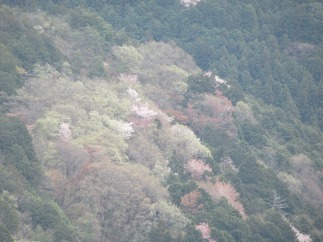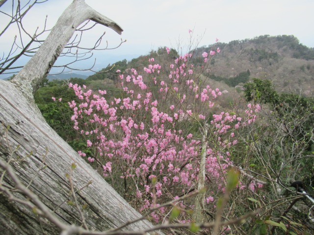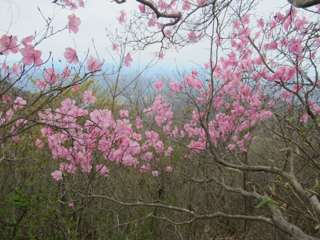 北コース広場の少し上分岐を富士見峠方面に向かわず左に折れるとカタクリの群生地、盛りは過ぎていますが数多くの花をまだ楽しめました。尾根に出るとアカヤシオの花が満開で丁度見頃、花の数も多く、どうやら今年は当たり年なのではないかと思われます。東陵の見晴らし台からはアカヤシオ越しに559P、眼下に新緑とヤマザクラが柔らかく春真っ盛りです。山頂は30人程のハイカーで賑わっており、少し先の御嶽山まで足を延ばすと早くもミツバツツジやレンゲツツジまで咲いていました。