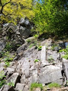 山頂はフェンス越しの展望で、笹が刈られてあった。そこにシートを広げてお昼を食べているとズボンに小さなポツポツ。ダニだった。Aさんのザックにはマダニが付いていて、ゆっくり食べている気分になれず早々に撤収。分岐まで戻り右手に折れ倶利伽羅不動経由で駐車場に戻った。