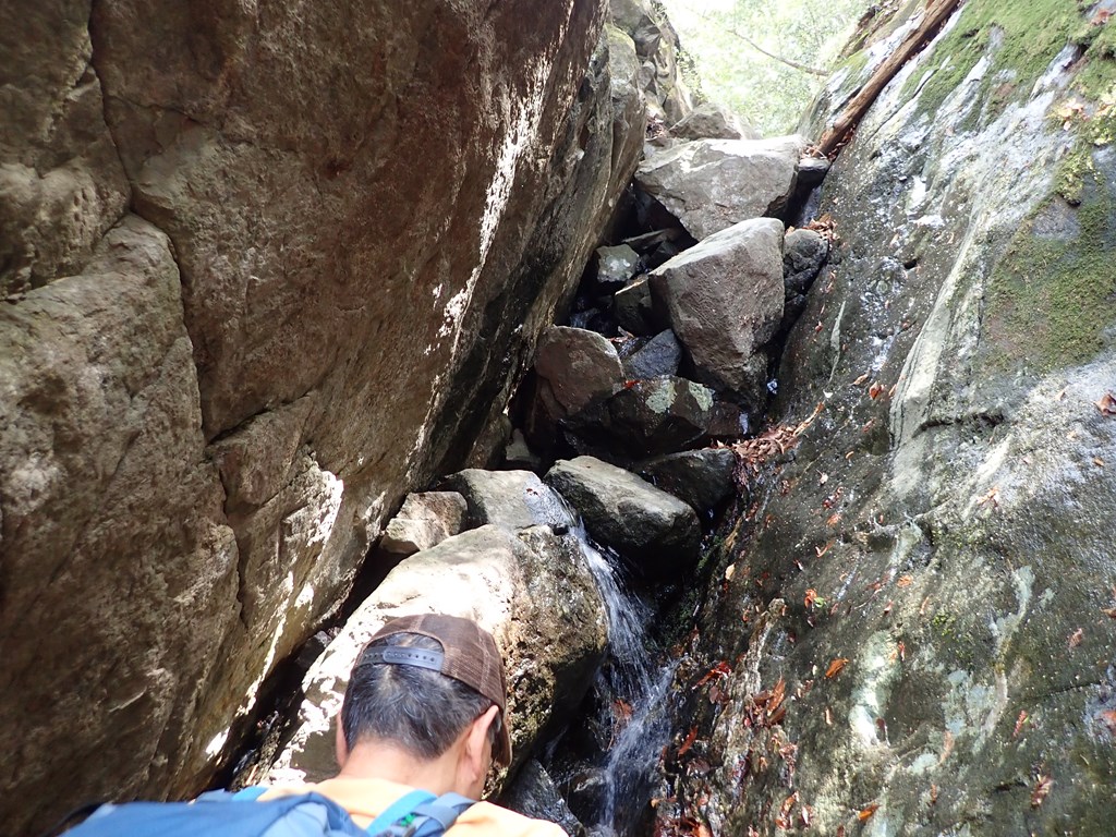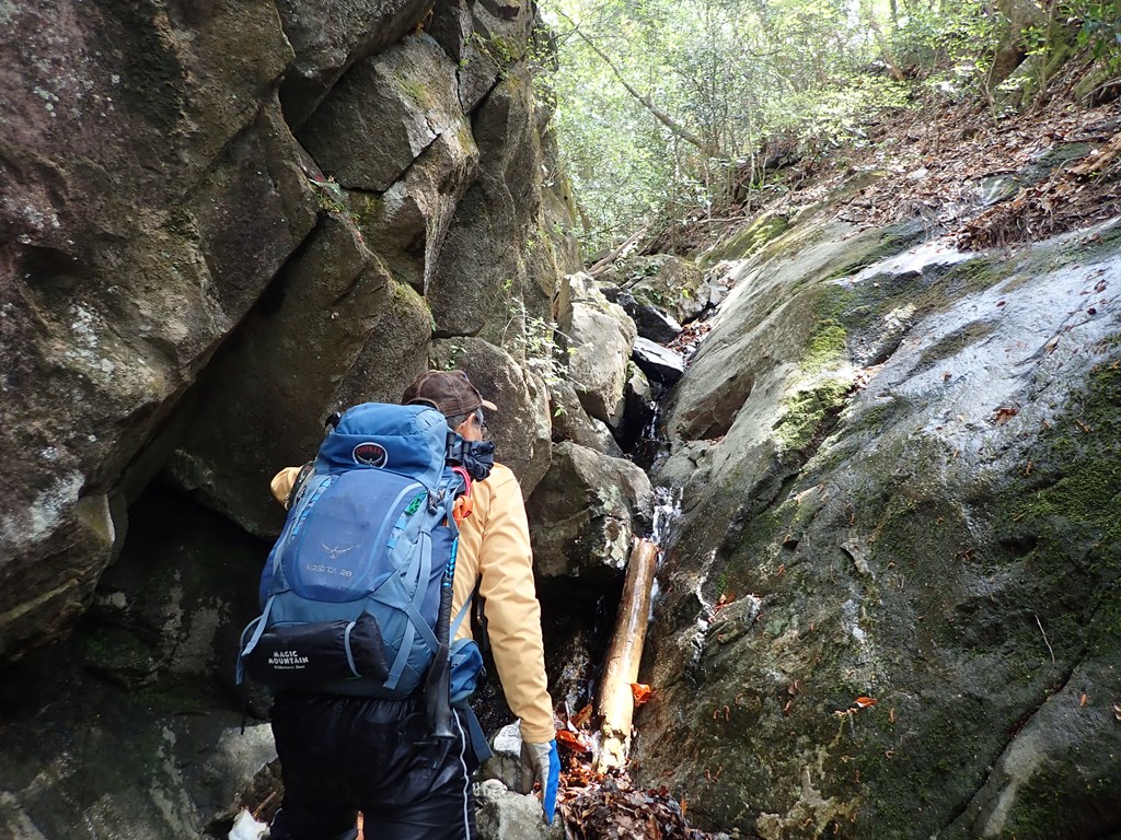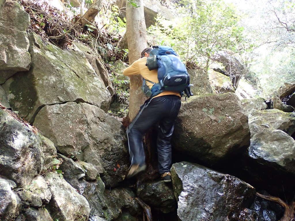 核心部最初は大木でせき止められた2Mぐらいの岩壁を登る。木に掴まって回り込むように登る。次は大岩がかぶさった谷を少し登る。次は一段と狭くなった谷だ。左右の岸は平らな大岩で、狭くなった谷に岩が挟まっている。水が少し流れているのでしぶきでズボンが濡れたがそれさえ我慢すれば登りやすい岩だった。最後の難所は立てかけられた木を踏み台にできた。無事核心部を通過。約15分の冒険だった。