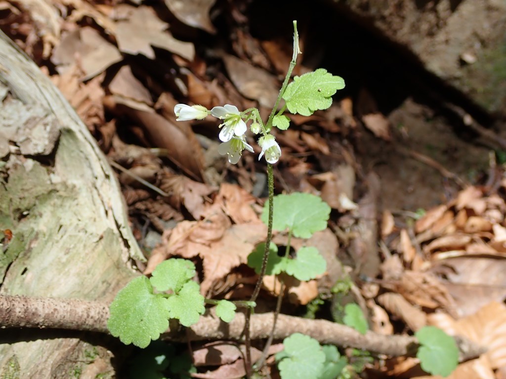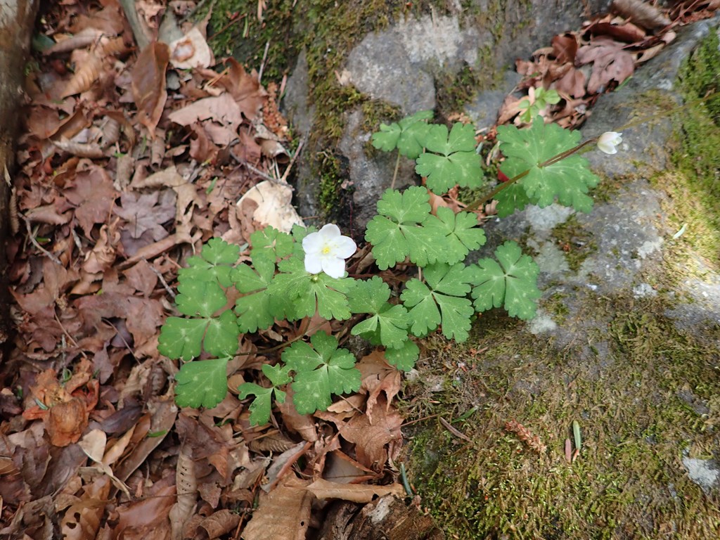 その先には3m程の高さの平滑な大岩が現れたが右側を登ることができた。その辺りからニリンソウが見られるようになる。その上の、先週、男女二人連れと会話を交わした辺りで小休止。その上も傾斜のある枯沢登りが続く。途中、マルバコンロンソウを見つけて喜んだ。そのすぐ上に左矢印のペンキがあった。左に回り込んで遊歩道に登る人が多いようだ。でも、私たちは直登を選んだ。岩は無くなったが急傾斜は続く。細い笹を掴んで登った。途中、大きな倒木、ユキザサを見て遊歩道にでた。近くの東屋で小休止。
