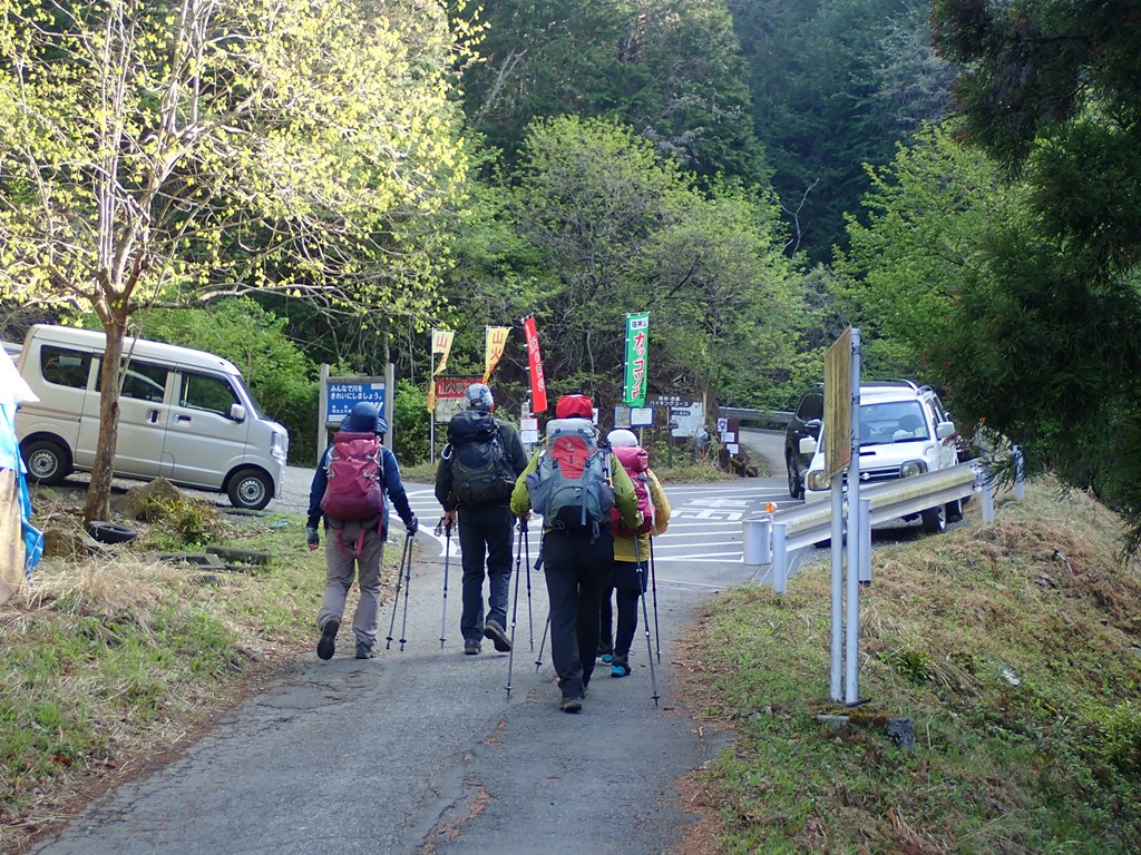 <詳細報告>小山を6時に出て、駒形集落最奥の駐車場に着くと、別行動でやって来たともさんは既に着いていて登山準備を始めていた。手前の空いている場所に駐車できた。7-8台が駐っていた。