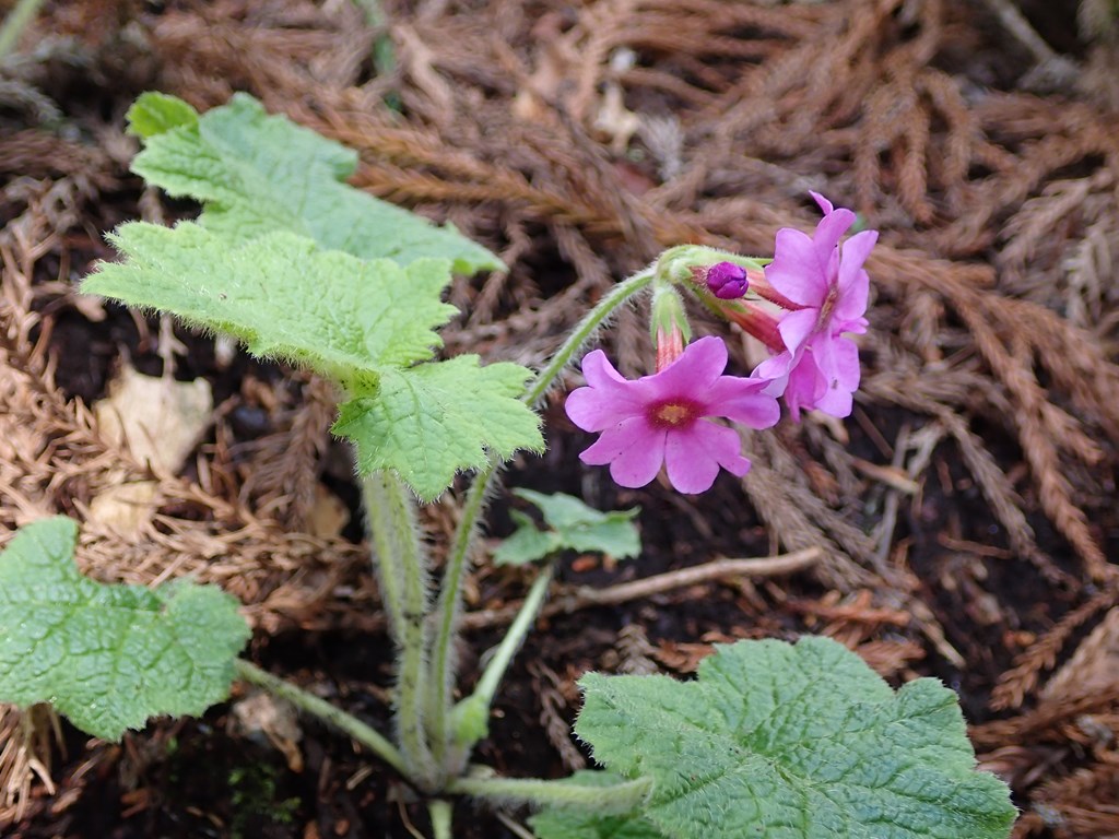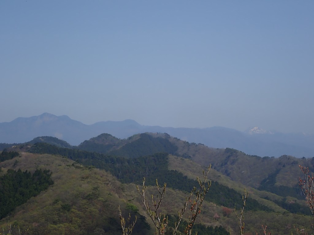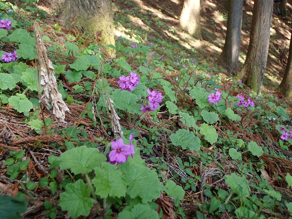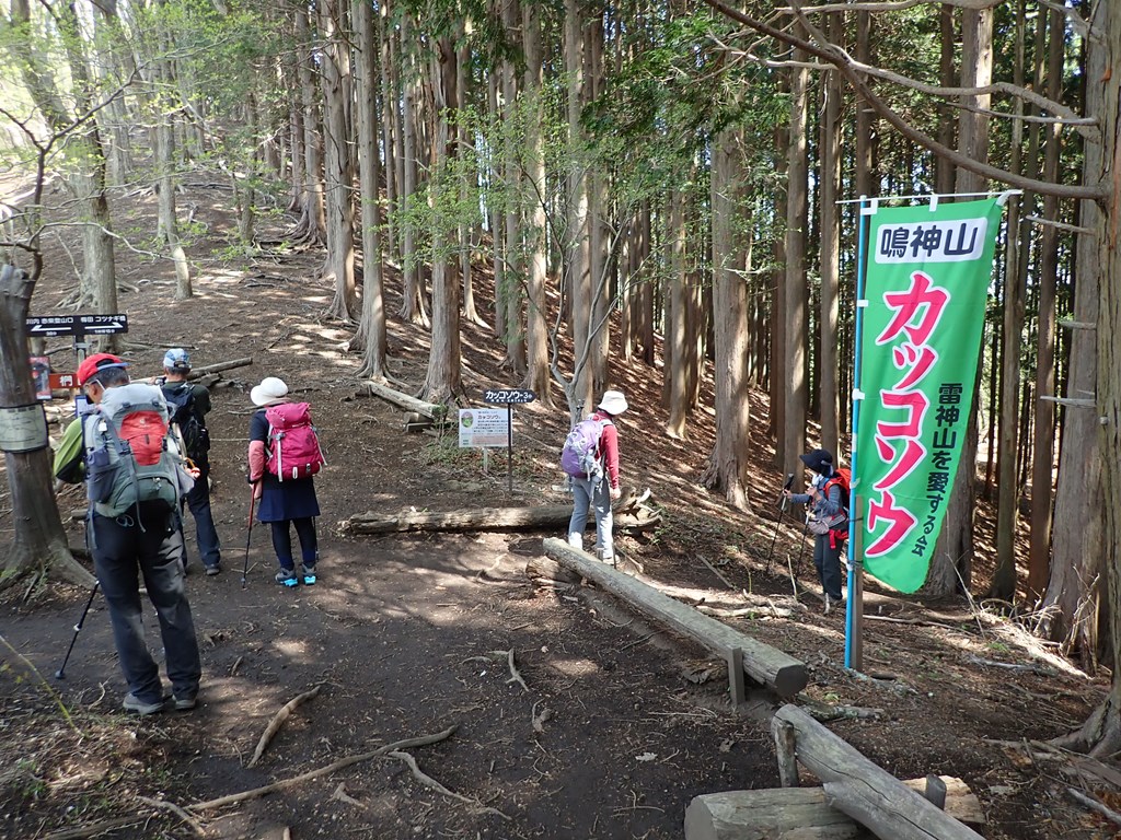 鳴神山山頂に到着。残念なことに遠くの山はぼやけていた。何とか男体山・白根山・皇海山・武尊山は見えたが、筑波山は全く見えなかった。小休止して下山開始。椚田峠への下りではコイワカガミを期待していたのだが、花はまだ小さな蕾だった。GWには咲き誇っているだろう。椚田峠から少し東に下ったカッコウソウの群生地にはピンク色の花が咲いていた。周りは網で囲われている。監視しているオジサンの話では網の中には細い針金が組み込まれているそうだ。そうしないと鹿に食い破られるらしい。カッコウソウの周りにはスミレも数種類咲いていたが、ナルカミスミレではないそうだ。一口500円の募金をやっていて払うとピンバッチがもらえる。保護には経費もかかるので致し方ないと思う。