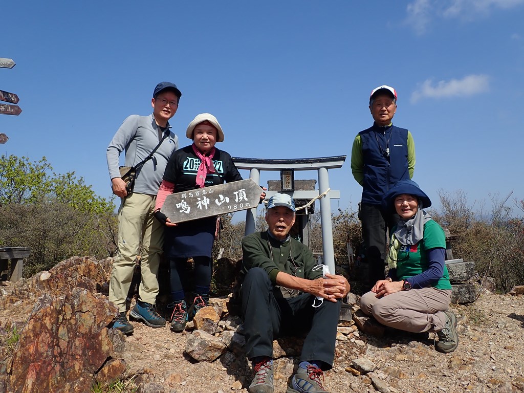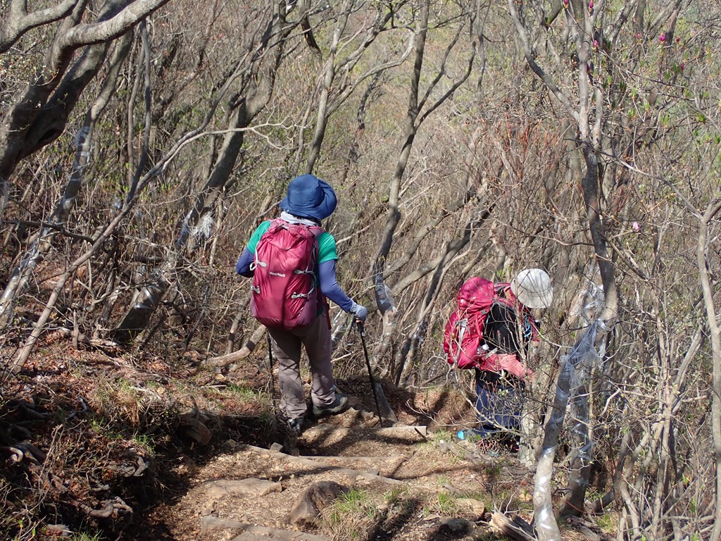 そこ先からは少しづつ岩が増えて傾斜もきつくなっていく。見上げると、ミツバツツジが咲いていた。山ツツジもあるが、早いものでもまだ蕾だった。数日で見頃になるのだろう。標高が上がるとアカヤシオも少し残っていた。肩の広場に到着。「なるかみ小舎」という休憩所らしき建物ができていた。私は初見だ。