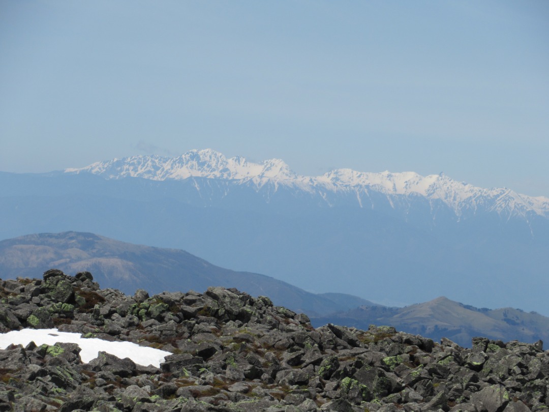 <概要>標高2,100m以上は残雪、天気も良く澄み切っていて、山頂からは妙高、北、中央、南アルプス、浅間、八ヶ岳など360度の大パノラマを満喫出来ました。