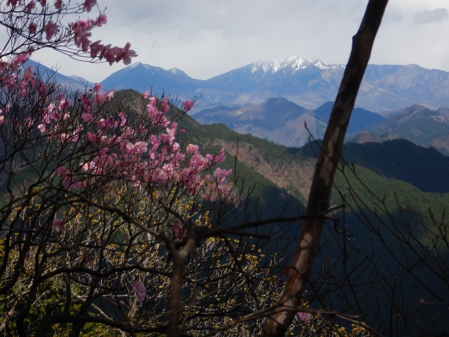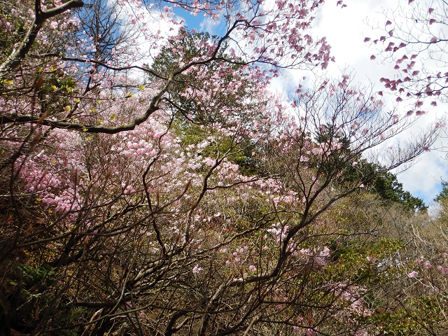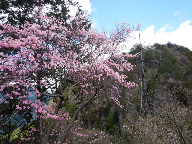 <詳細報告>登山口の加蘇山神社を8時出発予定で自宅を出発しましたが、途中道を間違えてしまい、結局1時間遅れの出発でした。登山道を進み、中ノ宮から岩場が始まり、岩場にはアルミ製のハシゴがかけられていました。雨上がりだったのでスリップに注意しながら山頂を目指します。東剣ヶ峰あたりからアカヤシオを観ながらのハシゴのアップダウン。西剣ヶ峰、石裂山は樹林帯の中。その先の月山山頂は山いちめんピンク色で、思わぬご褒美に今までの疲れを忘れてしまうほどでした。