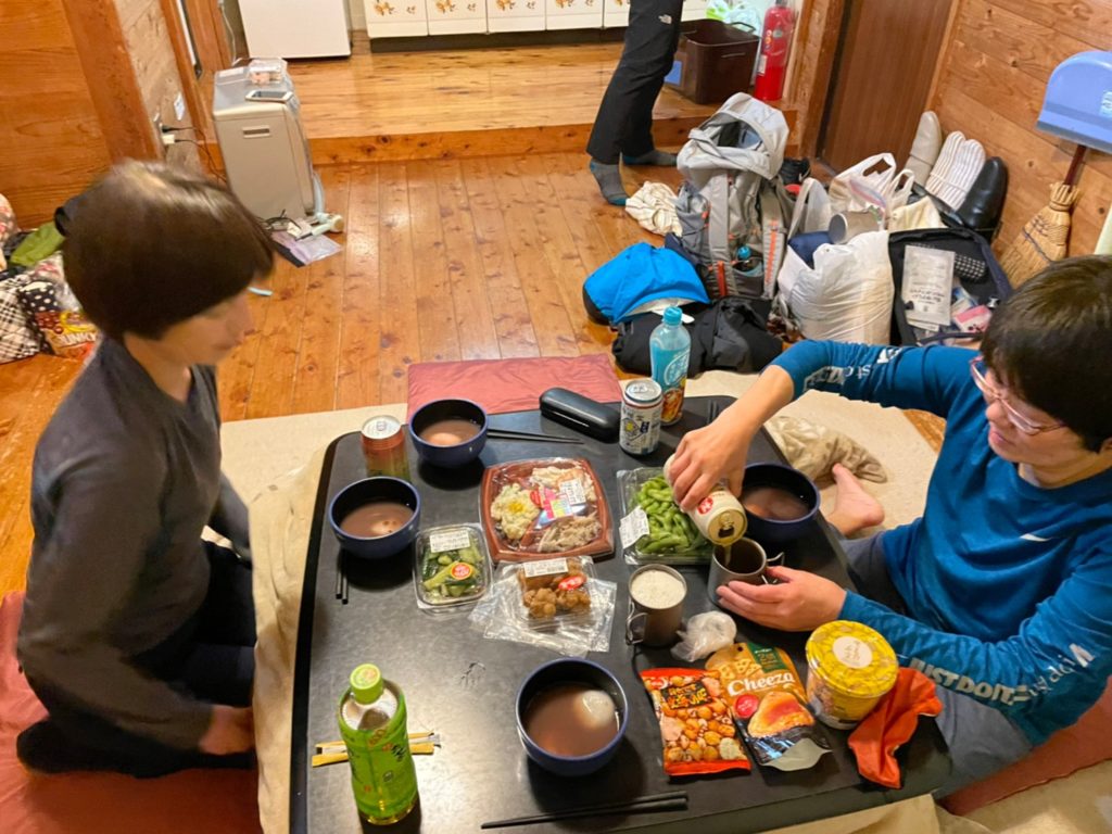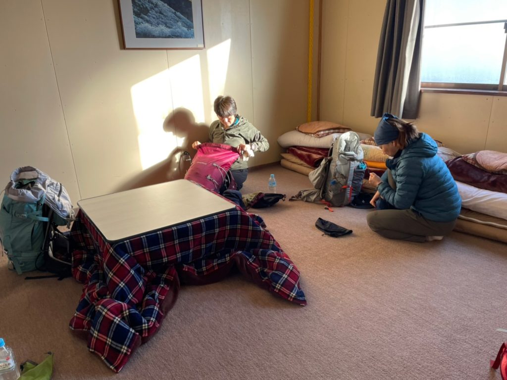 ここまでの移動距離が長く、時間を要した。小屋に入る時間ギリギリで見ノ越駅に着いた。頂上ヒュッテの夕食時間(17:00~)に間に合うようにと言い訳しながらの軟弱メンバー4名、すかさずリフトで西島駅へ向かった。西島駅から山頂までの標高差は205m、ヒュッテまで一番近い尾根コースをたどり、30分ほどで頂上ヒュッテ(1955m)に到着した。ヒュッテの部屋は、基本的にグループごとと個室とドミトリーの2種類、1泊2食付き(夏料金)10,500円、素泊まり6,500円、夕食のみ9,500円、朝食のみ7,500円、各部屋にコタツが設置されていて有難かった。お風呂は(行水程度で、お湯は洗面器で一人5杯まで、シャンプー、石鹼使用は出来ない)私たちは一泊二食付きでの予約、南西の眺めの良い部屋に案内された。
