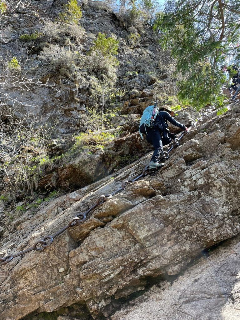 天狗岳に行き交う人が一段落した所を狙い、私達も天狗岳に向かった。最初の一歩の下りに少々怖さを感じた。鎖をしっかり掴み、後ろ向きで足元を良く確認しながら慎重に下る。