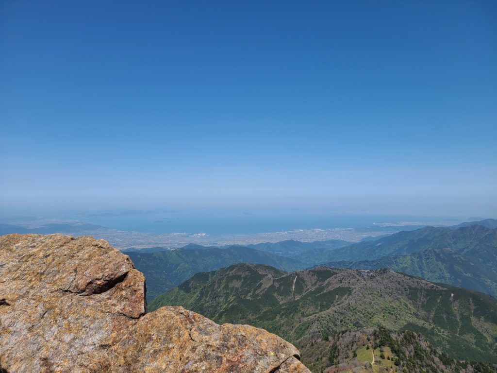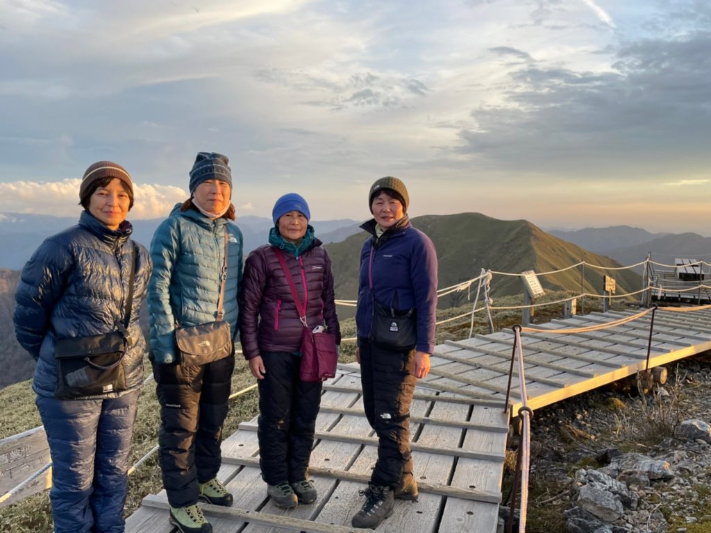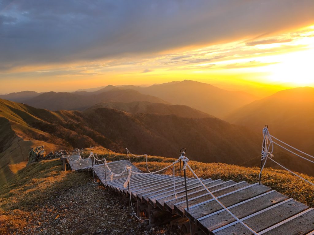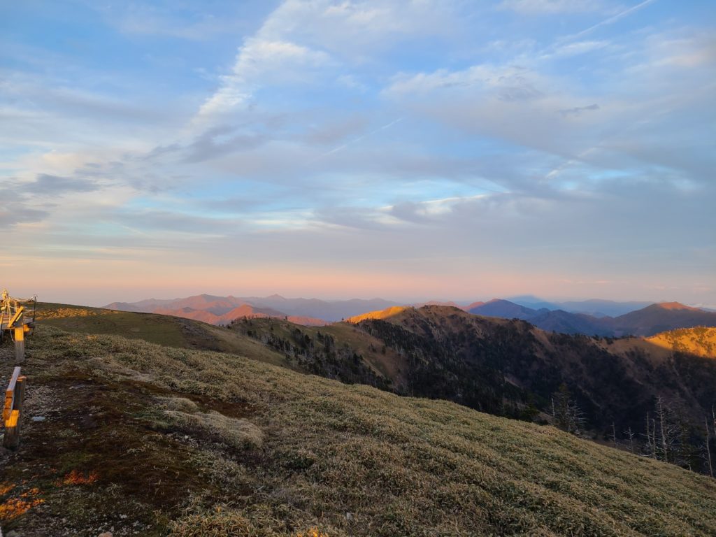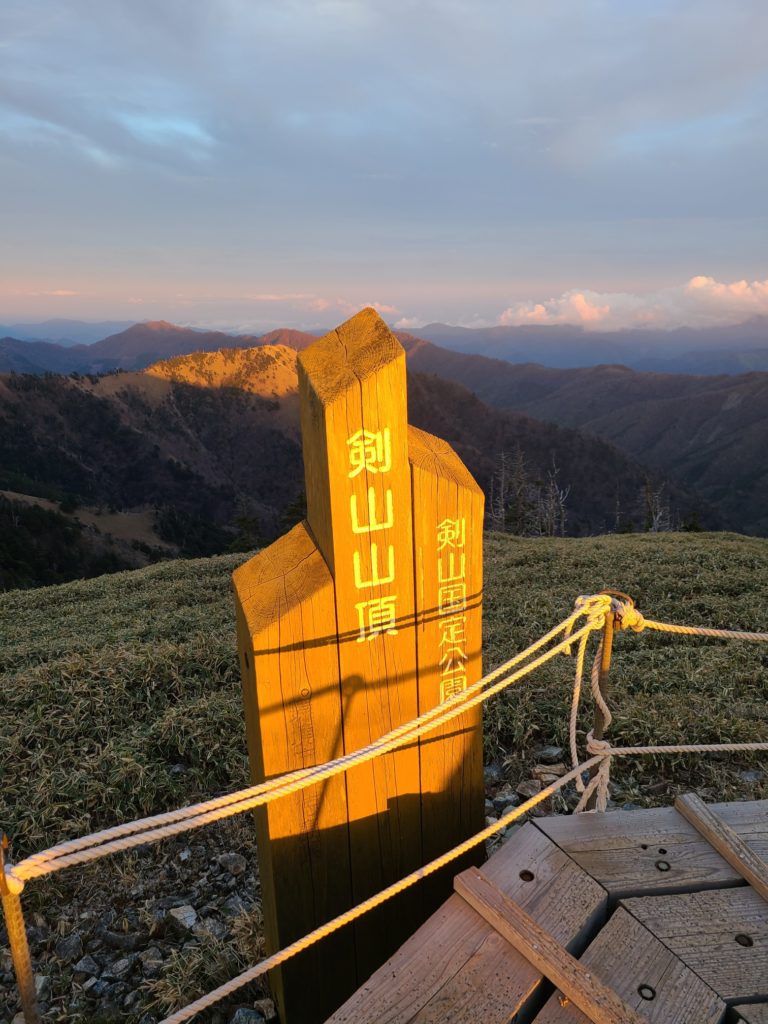 木道の先にはデッキもあり、頂上からの360°のロケーションが素晴らしく、西南方面の山々、明日歩く予定の次郎笈までの素晴らしい稜線、薄っすらと石鎚山方面も望め、日没の時間を十分に楽しんだ。