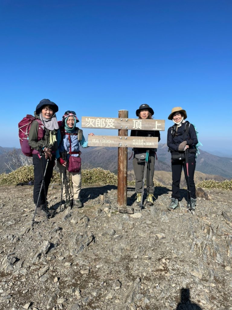 分岐からジロウギュウ峠、次郎笈山頂までの1300mの登りで息があがった。天気が良いので、次郎笈からの眺めが良く、十分に展望を楽しむことができ満足だった。ジロウギュウ峠(1791m)に向かって下山開始、1800mの分岐から剣山の西斜面をトラーバースし大劔神社に向かった。名水百選 御神水で有難い水を頂き、西島駅に向かった。