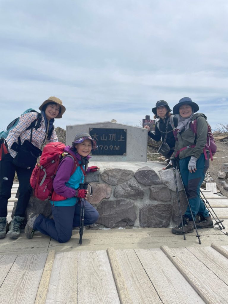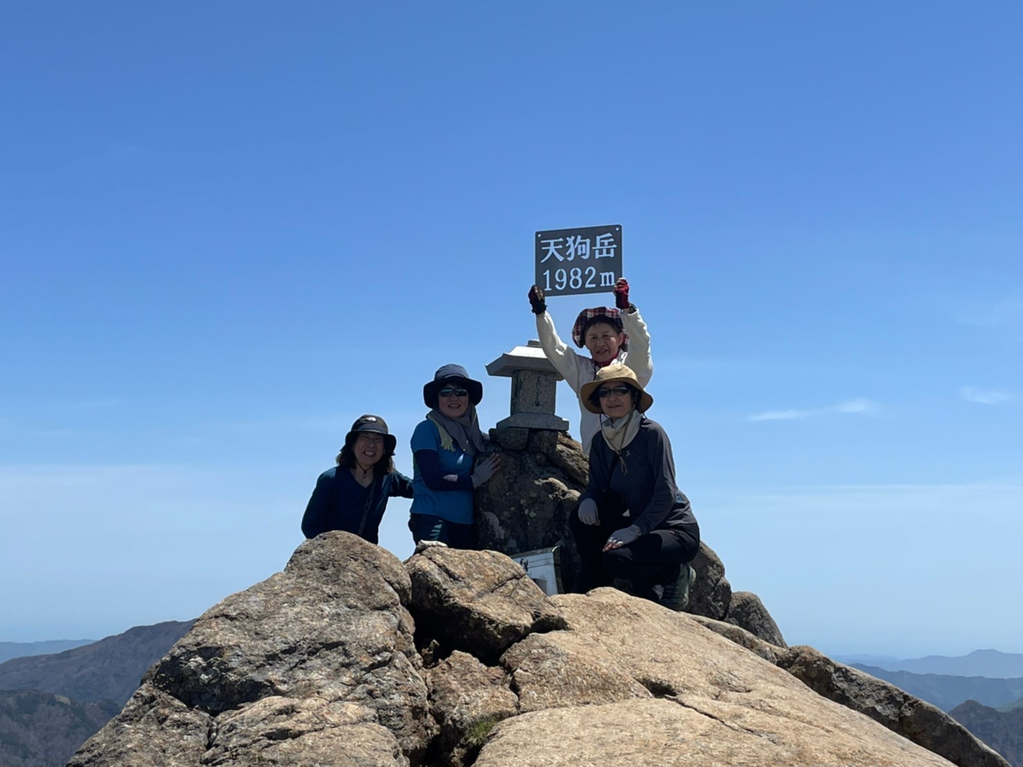 狭い稜線の左右は絶壁なので慎重に進みながら天狗岳山頂に向かった。山頂では写真撮りの順番待ち、後ろの方に撮影をお願いし、四人でカメラに収まった。
